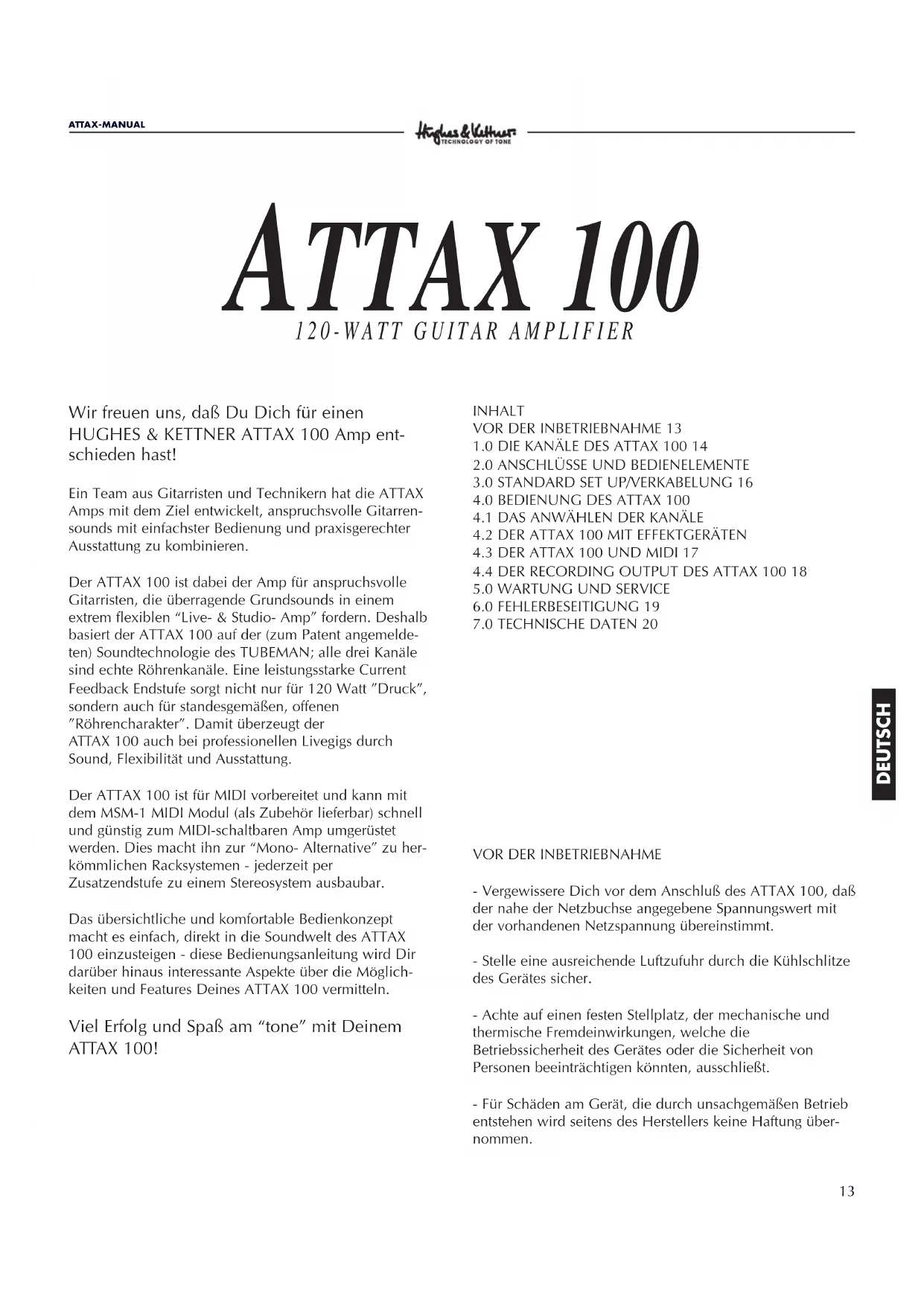 PREAMP SECTION: CLEAN, CRUNCH + LEAD tube channels LOW INPUT: -10 dBV/ 1 M ohms HIGH INPUT: -20 dBV/ 1 M ohms FX-RETURN: -10dBV/ 0dBV/ 47 k ohms FX-SEND: 0 dBV/ -10dBV/ 1 k ohms REC.OUT: -3 dBV/ 800 ohms POWERAMP SECTION: 'CURRENT FEEDBACK' solid state power amp Output Power: 90 W rms into 8 ohms 120 W rms into 4 ohms PHONES: 0,5 W, 600 ohms Freqency response: 20 Hz - 50 kHz (into 4 ohms) Speakers: CELESTION RockDriver Vintage, 12“, 8 ohms GENERAL FEATURES: Voltage: 230 V~ (European model) 117 V~ (North American model) 100 V~ (Japanese model) Max. power consumption: 200 VA (into 4 ohms) Mains Fuse: slo-blo 1000 mA (230 V model) slo-blo 2000 mA (117 V model) slo-blo 2500 mA (100 V model) Secondary Fuses: 2 x slo-blo 2500 mA (power amp) slo-blo 500 mA (tube) Dimensions: combo: 560 x 500 x 285 mm (W x H x D) approx. 22 x 19,5 x 11,25“ head: 690 x 270 x 270 mm (W x H x D) approx. 27 x 10,5 x 10,6“ Weight: combo approx. 40 Lbs./ 18 kg, head approx. 35 Lbs./ 16 kg13 ATTAX-MANUAL DEUTSCH Wir freuen uns, daß Du Dich für einen HUGHES & KETTNER ATTAX 100 Amp ent- schieden hast! Ein Team aus Gitarristen und Technikern hat die ATTAX Amps mit dem Ziel entwickelt, anspruchsvolle Gitarren- sounds mit einfachster Bedienung und praxisgerechter Ausstattung zu kombinieren. Der ATTAX 100 ist dabei der Amp für anspruchsvolle Gitarristen, die überragende Grundsounds in einem extrem flexiblen “Live- & Studio- Amp” fordern. Deshalb basiert der ATTAX 100 auf der (zum Patent angemelde- ten) Soundtechnologie des TUBEMAN; alle drei Kanäle sind echte Röhrenkanäle. Eine leistungsstarke Current Feedback Endstufe sorgt nicht nur für 120 Watt ”Druck”, sondern auch für standesgemäßen, offenen ”Röhrencharakter”. Damit überzeugt der ATTAX 100 auch bei professionellen Livegigs durch Sound, Flexibilität und Ausstattung. Der ATTAX 100 ist für MIDI vorbereitet und kann mit dem MSM-1 MIDI Modul (als Zubehör lieferbar) schnell und günstig zum MIDI-schaltbaren Amp umgerüstet werden. Dies macht ihn zur “Mono- Alternative” zu her- kömmlichen Racksystemen - jederzeit per Zusatzendstufe zu einem Stereosystem ausbaubar. Das übersichtliche und komfortable Bedienkonzept macht es einfach, direkt in die Soundwelt des ATTAX 100 einzusteigen - diese Bedienungsanleitung wird Dir darüber hinaus interessante Aspekte über die Möglich- keiten und Features Deines ATTAX 100 vermitteln. Viel Erfolg und Spaß am “tone” mit Deinem ATTAX 100! INHALT