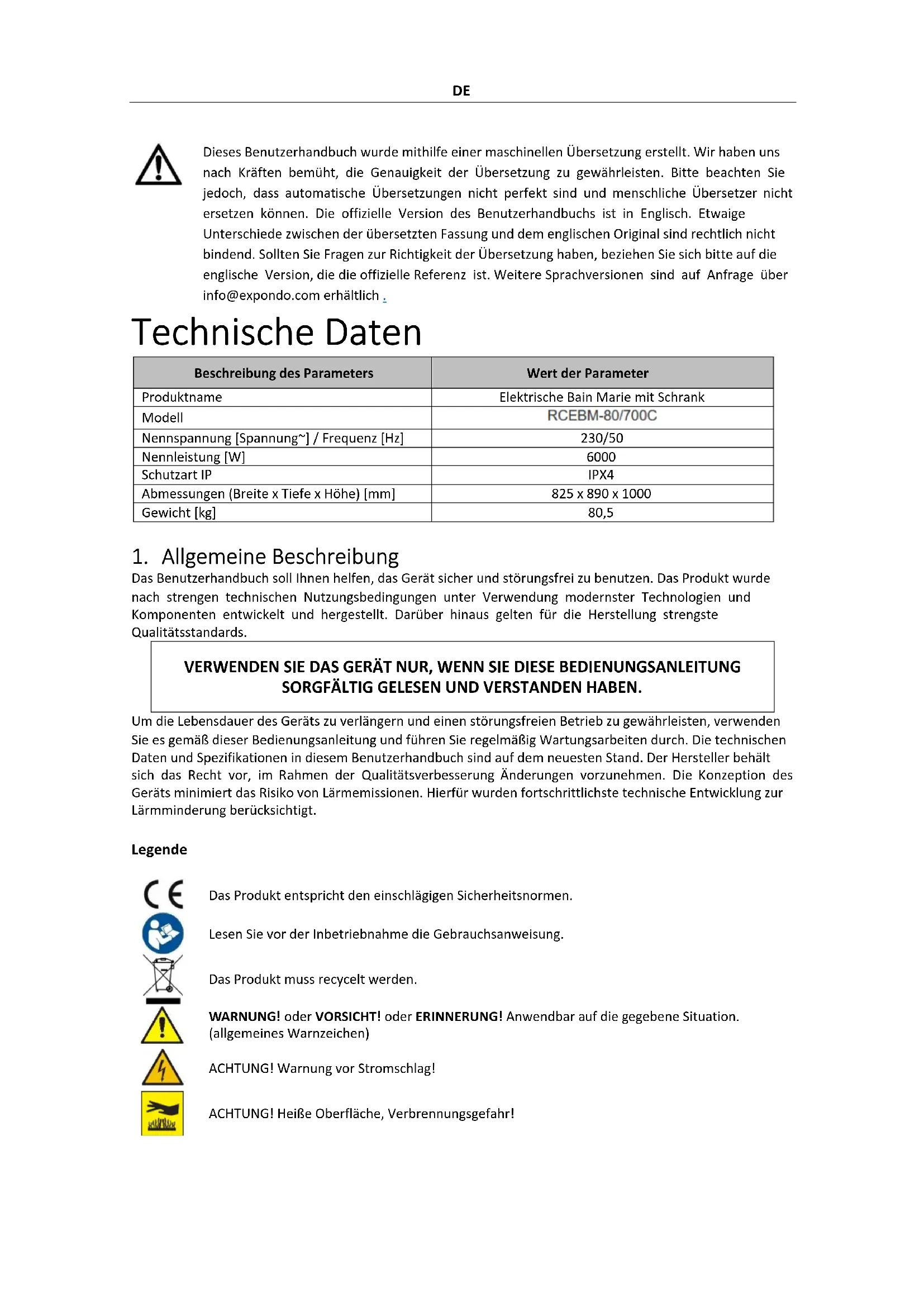 Dieses Benutzerhandbuch wurde mithilfe einer maschinellen Übersetzung erstellt. Wir haben uns nach Kräften bemüht, die Genauigkeit der Übersetzung zu gewährleisten. Bitte beachten Sie jedoch, dass automatische Übersetzungen nicht perfekt sind und menschliche Übersetzer nicht ersetzen können. Die offizielle Version des Benutzerhandbuchs ist in Englisch. Etwaige Unterschiede zwischen der übersetzten Fassung und dem englischen Original sind rechtlich nicht bindend. Sollten Sie Fragen zur Richtigkeit der Übersetzung haben, beziehen Sie sich bitte auf die englische Version, die die offizielle Referenz ist. Weitere Sprachversionen sind auf Anfrage über info@expondo.com erhältlich . Technische Daten Beschreibung des Parameters Wert der Parameter Produktname Elektrische Bain Marie mit Schrank Modell