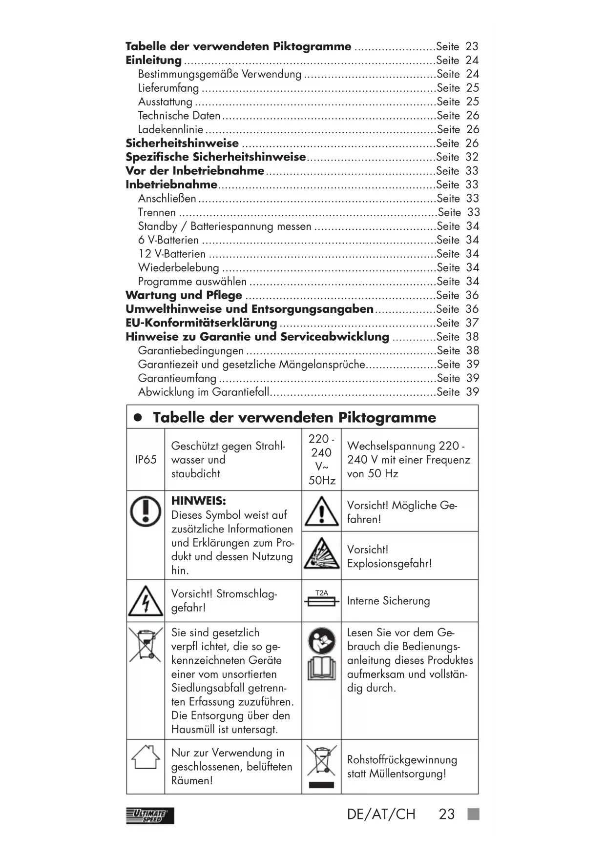 50Hz Wechselspannung 220 - 240 V mit einer Frequenz von 50 Hz HINWEIS: Dieses Symbol weist auf zusätzliche Informationen und Erklärungen zum Pro- dukt und dessen Nutzung hin. Vorsicht! Mögliche Ge- fahren! Vorsicht! Explosionsgefahr! Vorsicht! Stromschlag- gefahr! T 2 A Interne Sicherung Sie sind gesetzlich verpfl ichtet, die so ge- kennzeichneten Geräte einer vom unsortierten Siedlungsabfall getrenn- ten Erfassung zuzuführen. Die Entsorgung über den Hausmüll ist untersagt. Lesen Sie vor dem Ge- brauch die Bedienungs- anleitung dieses Produktes aufmerksam und vollstän- dig durch. Nur zur Verwendung in geschlossenen, belüfteten Räumen! Rohstoffrückgewinnung statt Müllentsorgung! Tabelle der verwendeten Piktogramme ........................Seite 23 Einleitung ..........................................................................Seite 24 Bestimmungsgemäße Verwendung .......................................Seite 24 Lieferumfang .....................................................................Seite 25 Ausstattung .......................................................................Seite 25 Technische Daten ...............................................................Seite 26 Ladekennlinie ....................................................................Seite 26 Sicherheitshinweise .........................................................Seite 26 Spezifi sche Sicherheitshinweise ......................................Seite 32 Vor der Inbetriebnahme ..................................................Seite 33 Inbetriebnahme ................................................................Seite 33 Anschließen ......................................................................Seite 33 Trennen ............................................................................Seite 33 Standby / Batteriespannung messen ....................................Seite 34 6 V-Batterien .....................................................................Seite 34 12 V-Batterien ...................................................................Seite 34 Wiederbelebung ...............................................................Seite 34 Programme auswählen .......................................................Seite 34 Wartung und Pfl ege ........................................................Seite 36 Umwelthinweise und Entsorgungsangaben ..................Seite 36 EU-Konformitätserklärung ..............................................Seite 37 Hinweise zu Garantie und Serviceabwicklung .............Seite 38 Garantiebedingungen ........................................................Seite 38 Garantiezeit und gesetzliche Mängelansprüche .....................Seite 39 Garantieumfang ................................................................Seite 39 Abwicklung im Garantiefall .................................................Seite 39 497453_2204_Kfz-Ladegerat ULGD 5_0 D2_content_LB8.indb 23497453_2204_Kfz-Ladegerat ULGD 5_0 D2_content_LB8.indb 23 27.06.22 11:1327.06.22 11:1324 DE/AT/CH Verpackungs- material - Sonstige Pappe Entsorgen Sie Verpackung und Gerät umweltgerecht! Geeignet für Motorräder (Programm 2) Geeignet für PKWs (Programm 3) Geeignet zum Laden von 12 V-Batterien Geeignet zum Laden von 6 V-Batterien Gleichstrom Hergestellt aus Recyclingmaterial 6 V-Modus (Programm 1) Schutzklasse II Elektrische Verbindungen vor Regen schützen! Winter-AGM-Modus (Programm 4) Nicht rauchen! Flammen und Funken ver- meiden! Symbol Verpolung Symbol Standby Kfz-Batterieladegerät ULGD 5.0 D2 z Einleitung Herzlichen Glückwunsch! Sie haben sich für ein hochwertiges Produkt aus unserem Haus entschieden. Machen Sie sich vor der ersten Inbetrieb- nahme mit dem Produkt vertraut. Lesen Sie hierzu aufmerksam die nach- folgende Bedienungsanleitung und die Sicherheitshinweise. NICHT IN DIE HÄNDE VON KINDERN KOMMEN LASSEN! z Bestimmungsgemäße Verwendung Das Ultimate Speed ULGD 5.0 D2 ist ein mehrstufiges Kfz-Batterieladege- rät, das zur Aufladung und Erhaltungsladung von 6 V- (3 Zellen) oder 12 V- (6 Zellen) Blei-Akkus (Batterien wartungsfrei (MF), offen) mit Elektrolyt- Lösung (WET), mit Elektrolyt absorbierenden Matten (AGM), mit gelför- migem Elektrolyt (GEL) oder Calcium-Akkus geeignet ist. Das Gerät ist nicht zur Aufladung von Lithium-Ionen-Akkus geeignet! Außerdem können Sie entladene Batterien regenerieren (abhängig vom Batterietyp). Das Kfz - Batterieladegerät verfügt über eine Schutzschaltung gegen Funkenbil- dung und Überhitzung. Bewahren Sie diese Anleitung gut auf. Händigen Sie alle Unterlagen bei Weitergabe des Produkts an Dritte ebenfalls mit aus. Jegliche Anwendung, die von der bestimmungsgemäßen Verwen- dung abweicht, ist untersagt und potentiell gefährlich. Schäden durch Nichtbeachtung oder Fehlanwendung werden nicht von der Garantie abgedeckt und fallen nicht in den Haftungsbereich des Herstellers. Das 497453_2204_Kfz-Ladegerat ULGD 5_0 D2_content_LB8.indb 24497453_2204_Kfz-Ladegerat ULGD 5_0 D2_content_LB8.indb 24 27.06.22 11:1327.06.22 11:13DE/AT/CH