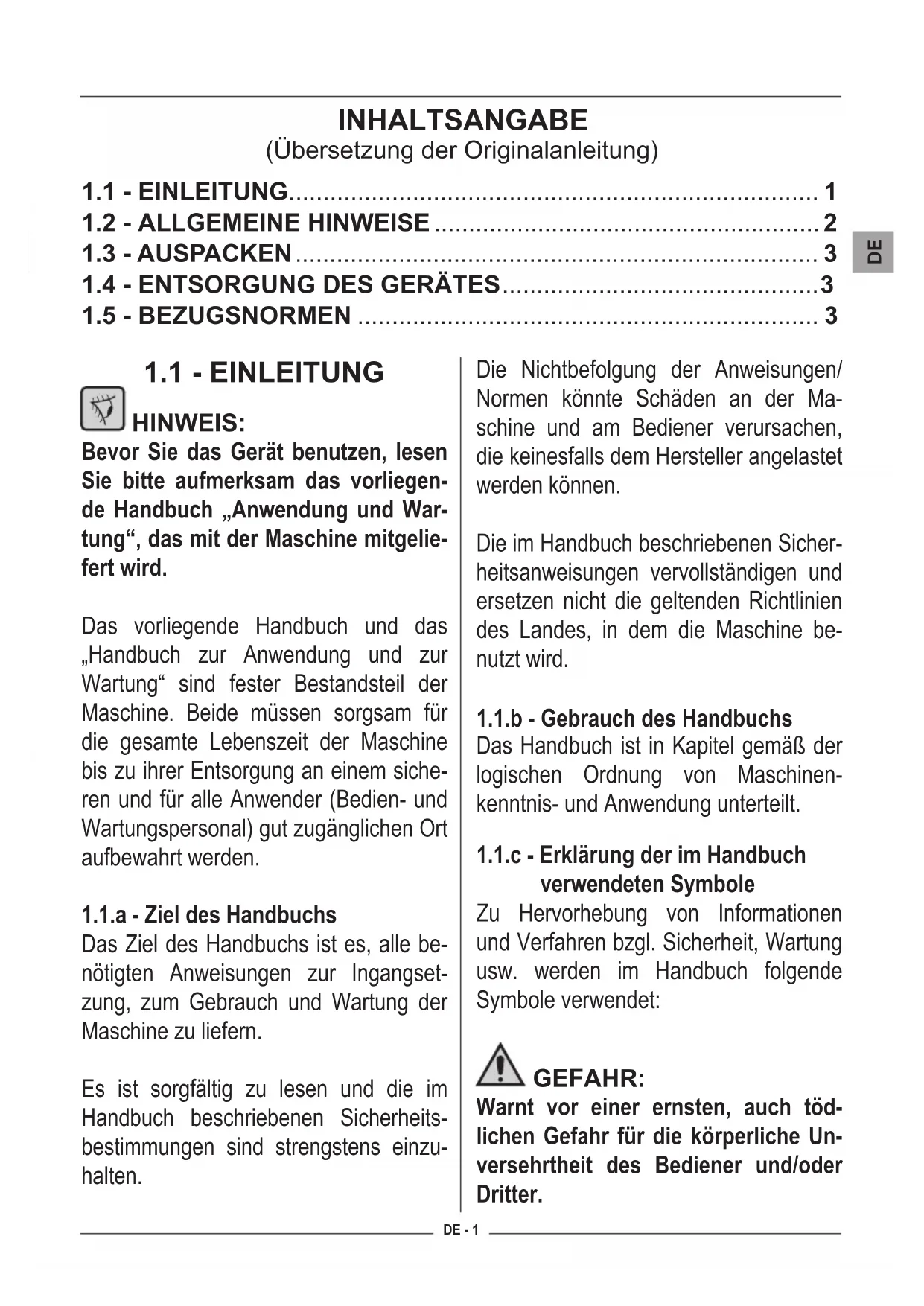 HINWEIS: Bevor Sie das Gerät benutzen, lesen Sie bitte aufmerksam das vorliegen- de Handbuch „Anwendung und War- tung“, das mit der Maschine mitgelie- fert wird. Das vorliegende Handbuch und das „Handbuch zur Anwendung und zur Wartung“ sind fester Bestandsteil der Maschine. Beide müssen sorgsam für die gesamte Lebenszeit der Maschine bis zu ihrer Entsorgung an einem siche- ren und für alle Anwender (Bedien- und Wartungspersonal) gut zugänglichen Ort aufbewahrt werden.