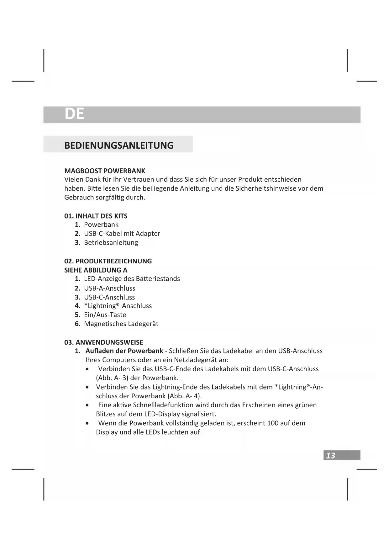 BEDIENUNGSANLEITUNG MAGBOOST POWERBANK Vielen Dank für Ihr Vertrauen und dass Sie sich für unser Produkt entschieden haben. Bie lesen Sie die beiliegende Anleitung und die Sicherheitshinweise vor dem Gebrauch sorgfälg durch.