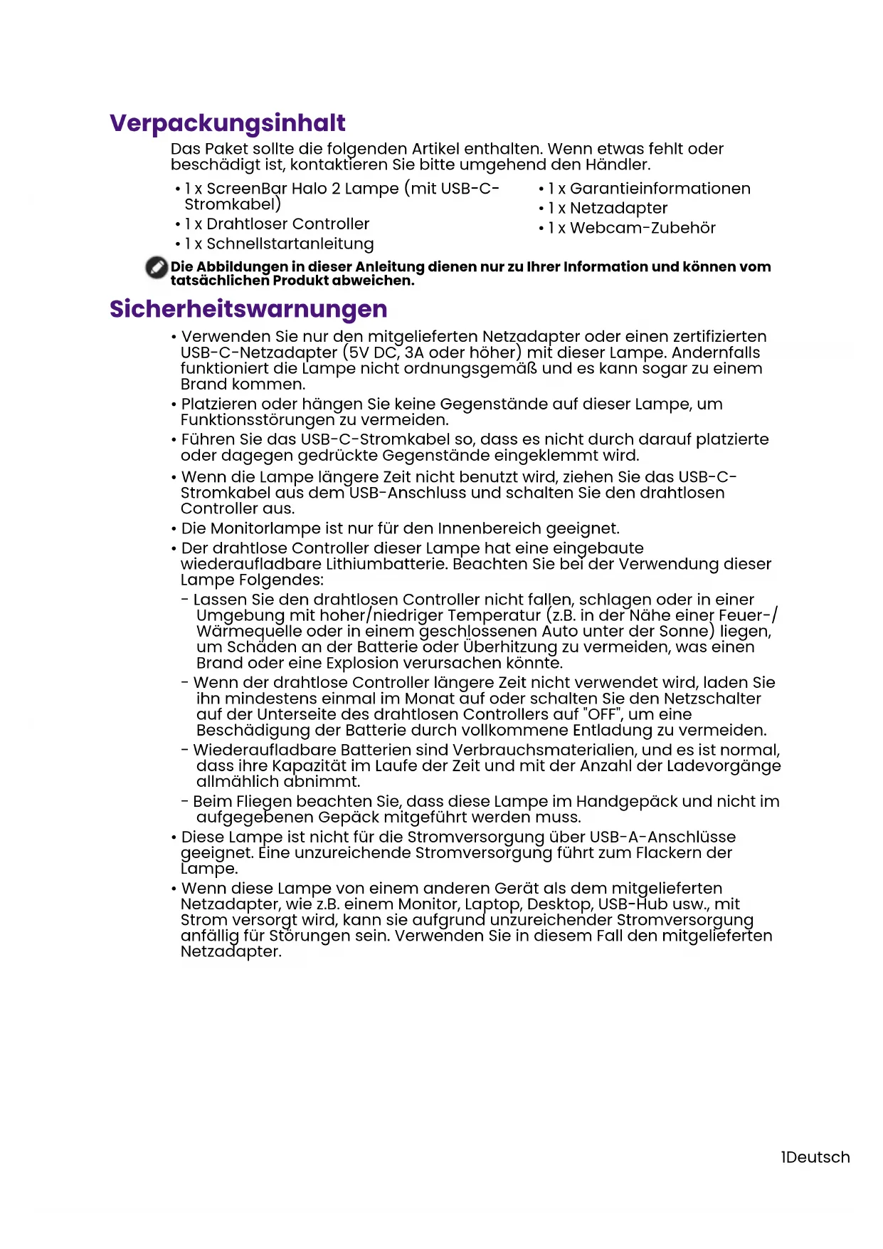 (0.15 in)1Deutsch Verpackungsinhalt Das Paket sollte die folgenden Artikel enthalten. Wenn etwas fehlt oder beschädigt ist, kontaktieren Sie bitte umgehend den Händler. Die Abbildungen in dieser Anleitung dienen nur zu Ihrer Information und können vom tatsächlichen Produkt abweichen. Sicherheitswarnungen
