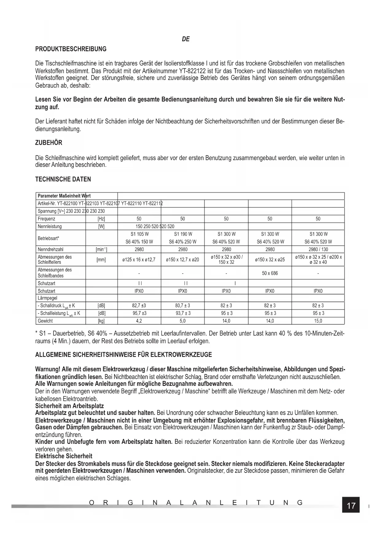 PRODUKTBESCHREIBUNG Die Tischschleifmaschine ist ein tragbares Gerät der Isolierstoff klasse I und ist für das trockene Grobschleifen von metallischen Werkstoff en bestimmt. Das Produkt mit der Artikelnummer YT-822122 ist für das Trocken- und Nassschleifen von metallischen Werkstoff en geeignet. Der störungsfreie, sichere und zuverlässige Betrieb des Gerätes hängt von seinem ordnungsgemäßen Gebrauch ab, deshalb: Lesen Sie vor Beginn der Arbeiten die gesamte Bedienungsanleitung durch und bewahren Sie sie für die weitere Nut- zung auf. Der Lieferant haftet nicht für Schäden infolge der Nichtbeachtung der Sicherheitsvorschriften und der Bestimmungen dieser Be- dienungsanleitung. ZUBEHÖR Die Schleifmaschine wird komplett geliefert, muss aber vor der ersten Benutzung zusammengebaut werden, wie weiter unten in dieser Anleitung beschrieben. TECHNISCHE DATEN Parameter Maßeinheit Wert Artikel-Nr. YT-822100 YT-822103 YT-822107 YT-822110 YT-822112 Spannung [V~] 230 230 230 230 230 Frequenz [Hz] 50 50 50 50 50 Nennleistung [W] 150 250 520 520 520 Betriebsart* S1 105 W S6 40% 150 W S1 190 W S6 40% 250 W S1 300 W S6 40% 520 W S1 300 W S6 40% 520 W S1 300 W S6 40% 520 W Nenndrehzahl [min