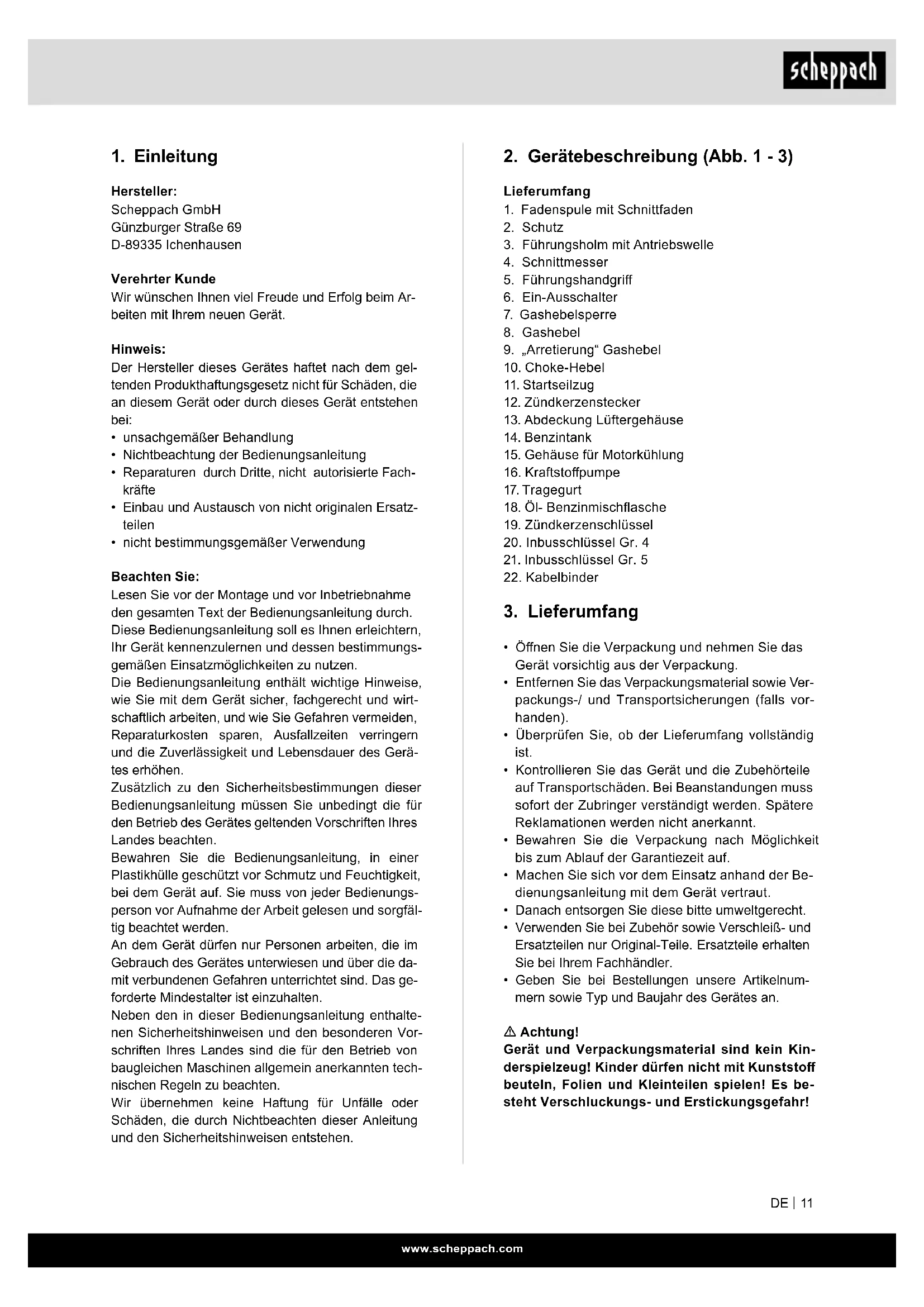 Máquina corta-mato a gasolina Tradução do manual de operação original Nachdrucke, auch auszugsweise, bedürfen der Genehmigung. Technische Änderungen vorbehalten. Abbildungen beispielhaft!www.scheppach.com 2www.scheppach.com