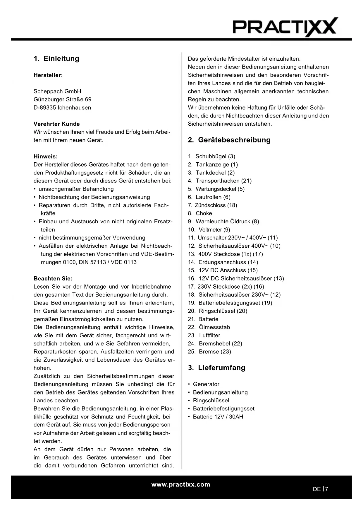 - Ausfällen der elektrischen Anlage bei Nichtbeach- tung der elektrischen Vorschriften und VDE-Bestim- mungen 0100, DIN 57113 / VDE 0113 Beachten Sie: Lesen Sie vor der Montage und vor Inbetriebnahme den gesamten Text der Bedienungsanleitung durch. Diese Bedienungsanleitung soll es Ihnen erleichtern, Ihr Gerät kennenzulernen und dessen bestimmungs- gemäßen Einsatzmöglichkeiten zu nutzen. Die Bedienungsanleitung enthält wichtige Hinweise, wie Sie mit dem Gerät sicher, fachgerecht und wirt- schaftlich arbeiten, und wie Sie Gefahren vermeiden, Reparaturkosten sparen, Ausfallzeiten verringern und die Zuverlässigkeit und Lebensdauer des Gerätes er- höhen. Zusätzlich zu den Sicherheitsbestimmungen dieser Bedienungsanleitung müssen Sie unbedingt die für den Betrieb des Gerätes geltenden Vorschriften Ihres Landes beachten. Bewahren Sie die Bedienungsanleitung, in einer Plas- tikhülle geschützt vor Schmutz und Feuchtigkeit, bei dem Gerät auf. Sie muss von jeder Bedienungsperson vor Aufnahme der Arbeit gelesen und sorgfältig beach- tet werden. An dem Gerät dürfen nur Personen arbeiten, die im Gebrauch des Gerätes unterwiesen und über die damit verbundenen Gefahren unterrichtet sind.w ww.practixx.com