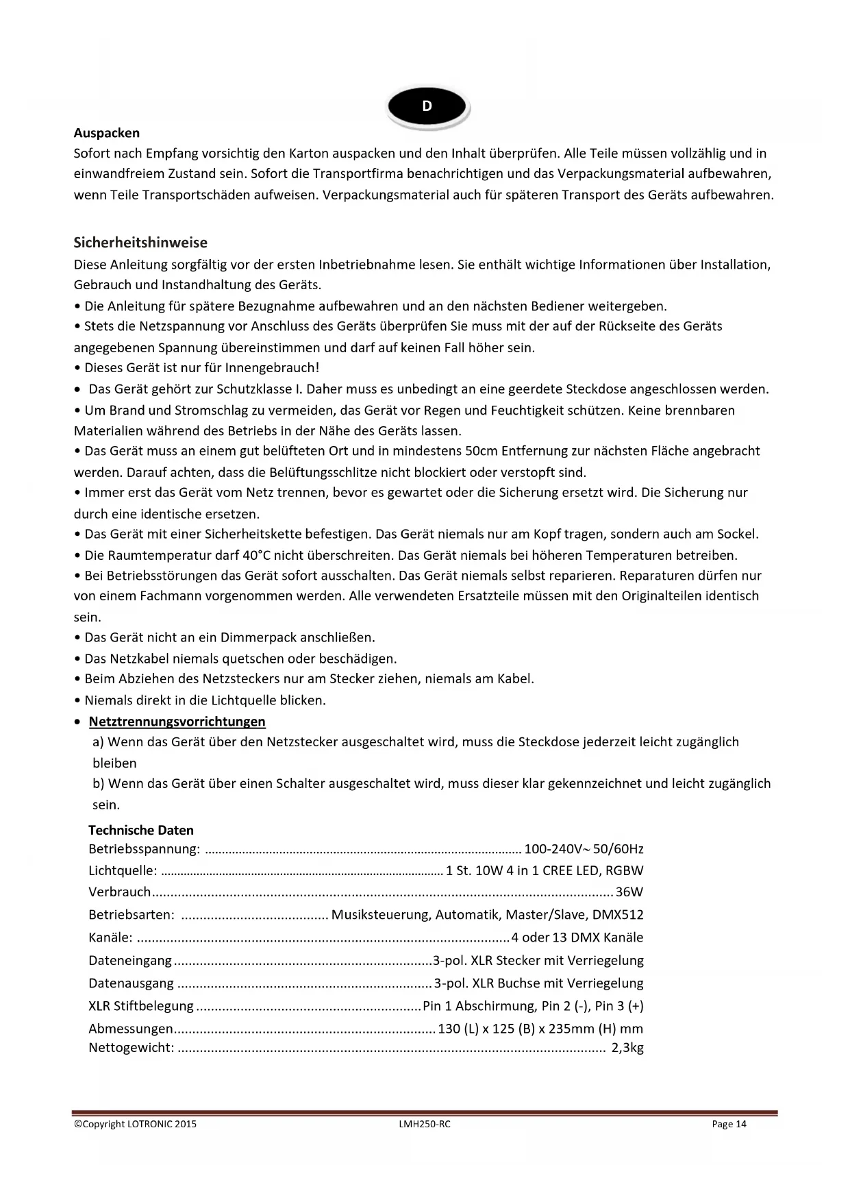 ©Copyright LOTRONIC 2015 LMH250-RC Page 13Auspacken Sofort nach Empfang vorsichtig den Karton auspacken und den Inhalt überprüfen. Alle Teile müssen vollzählig und in einwandfreiem Zustand sein. Sofort die Transportfirma benachrichtigen und das Verpackungsmaterial aufbewahren, wenn Teile Transportschäden aufweisen. Verpackungsmaterial auch für späteren Transport des Geräts aufbewahren. Sicherheitshinweise Diese Anleitung sorgfältig vor der ersten Inbetriebnahme lesen. Sie enthält wichtige Informationen über Installation, Gebrauch und Instandhaltung des Geräts.