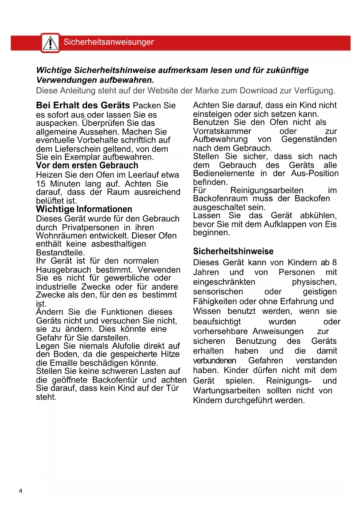 Inhaltsverzeichnisse4 Sicherheitsanweisungen Wichtige Sicherheitshinweise aufmerksam lesen und für zukünftige Verwendungen aufbewahren. Diese Anleitung steht auf der Website der Marke zum Download zur Verfügung. Bei Erhalt des Geräts Packen Sie es sofort aus oder lassen Sie es auspacken. Überprüfen Sie das allgemeine Aussehen. Machen Sie eventuelle Vorbehalte schriftlich auf dem Lieferschein geltend, von dem Sie ein Exemplar aufbewahren. Vor dem ersten Gebrauch Heizen Sie den Ofen im Leerlauf etwa 15 Minuten lang auf. Achten Sie darauf, dass der Raum ausreichend belüftet ist. Wichtige Informationen Dieses Gerät wurde für den Gebrauch durch Privatpersonen in ihren Wohnräumen entwickelt. Dieser Ofen enthält keine asbesthaltigen Bestandteile. Ihr Gerät ist für den normalen Hausgebrauch bestimmt. Verwenden Sie es nicht für gewerbliche oder industrielle Zwecke oder für andere Zwecke als den, für den es bestimmt ist. Ändern Sie die Funktionen dieses Geräts nicht und versuchen Sie nicht, sie zu ändern. Dies könnte eine Gefahr für Sie darstellen. Legen Sie niemals Alufolie direkt auf den Boden, da die gespeicherte Hitze die Emaille beschädigen könnte. Stellen Sie keine schweren Lasten auf die geöffnete Backofentür und achten Sie darauf, dass kein Kind auf der Tür steht. Achten Sie darauf, dass ein Kind nicht einsteigen oder sich setzen kann. Benutzen Sie den Ofen nicht als Vorratskammer oder zur Aufbewahrung von Gegenständen nach dem Gebrauch. Stellen Sie sicher, dass sich nach dem Gebrauch des Geräts alle Bedienelemente in der Aus-Position befinden. Für Reinigungsarbeiten im Backofenraum muss der Backofen ausgeschaltet sein. Lassen Sie das Gerät abkühlen, bevor Sie mit dem Aufklappen von Eis beginnen. Sicherheitshinweise Dieses Gerät kann von Kindern ab 8 Jahren und von Personen mit eingeschränkten physischen, sensorischen oder geistigen Fähigkeiten oder ohne Erfahrung und Wissen benutzt werden, wenn sie beaufsichtigt wurden oder vorhersehbare Anweisungen zur sicheren Benutzung des Geräts erhalten haben und die damit verbundenen Gefahren verstanden haben. Kinder dürfen nicht mit dem Gerät spielen. Reinigungs- und Wartungsarbeiten sollten nicht von Kindern durchgeführt werden.5 Sicherheitsanweisungen