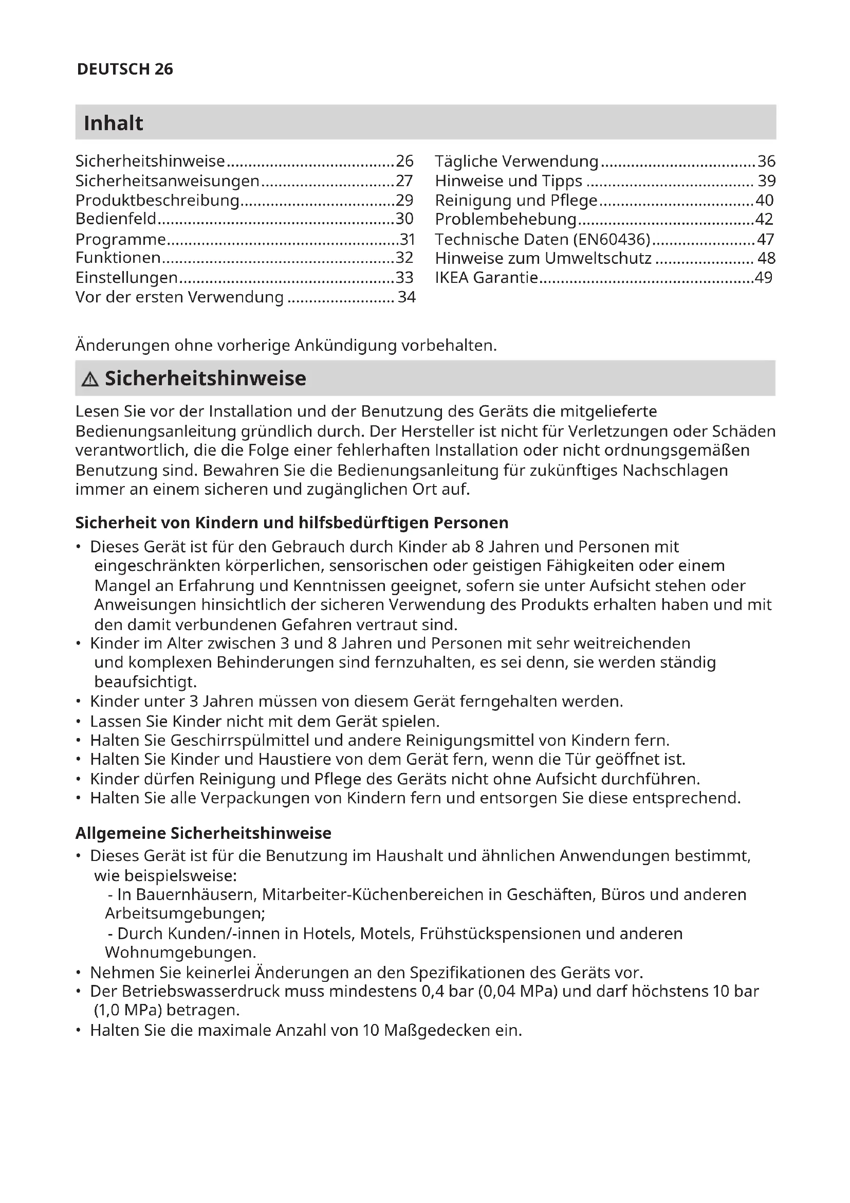 - Halten Sie die maximale Anzahl von 10 Maßgedecken ein. Sicherheitshinweise ....................................... 26 Sicherheitsanweisungen ............................... 27 Produktbeschreibung .................................... 29 Bedienfeld ....................................................... 30 Programme ......................................................31 Funktionen ...................................................... 32 Einstellungen .................................................. 33 Vor der ersten Verwendung ......................... 34 Tägliche Verwendung .................................... 36 Hinweise und Tipps ....................................... 39 Reinigung und Pege .................................... 40 Problembehebung ......................................... 42 Technische Daten (EN60436) ........................ 47 Hinweise zum Umweltschutz ....................... 48 IKEA Garantie ..................................................49DEUTSCH 27