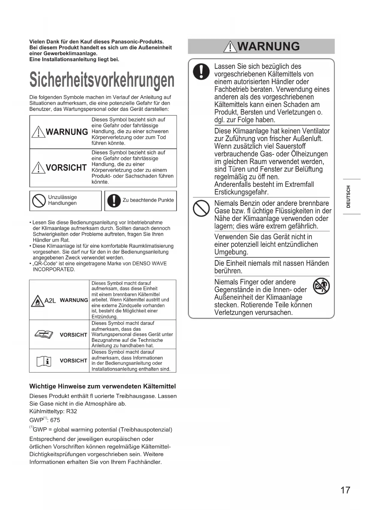 Resolución de problemas Consulte las instrucciones de funcionamiento adjuntas a la unidad interior. 00360620all.indb1600360620all.indb16 2024/06/249:31:342024/06/249:31:3417 DEUTSCHVielen Dank für den Kauf dieses Panasonic-Produkts.Bei diesem Produkt handelt es sich um die Außeneinheit einer Gewerbeklimaanlage.Eine Installationsanleitung liegt bei. Sicherheitsvorkehrungen Die folgenden Symbole machen im Verlauf der Anleitung auf Situationen aufmerksam, die eine potenzielle Gefahr für den Benutzer, das Wartungspersonal oder das Gerät darstellen: WARNUNG Dieses Symbol bezieht sich auf eine Gefahr oder fahrlässige Handlung, die zu einer schweren Körperverletzung oder zum Tod führen könnte. VORSICHT Dieses Symbol bezieht sich auf eine Gefahr oder fahrlässige Handlung, die zu einer Körperverletzung oder zu einem Produkt- oder Sachschaden führen könnte.Unzulässige HandlungenZu beachtende Punkte Lesen Sie diese Bedienungsanleitung vor Inbetriebnahme der Klimaanlage aufmerksam durch. Sollten danach dennoch Schwierigkeiten oder Probleme auftreten, fragen Sie Ihren Händler um Rat. Diese Klimaanlage ist für eine komfortable Raumklimatisierung vorgesehen. Sie darf nur für den in der Bedienungsanleitung angegebenen Zweck verwendet werden. „QR-Code“ ist eine eingetragene Marke von DENSO WAVE INCORPORATED. Lassen Sie sich bezüglich des vorgeschriebenen Kältemittels von einem autorisierten Händler oder Fachbetrieb beraten. Verwendung eines anderen als des vorgeschriebenen Kältemittels kann einen Schaden am Produkt, Bersten und Verletzungen o. dgl. zur Folge haben. Diese Klimaanlage hat keinen Ventilator zur Zuführung von frischer Außenluft. Wenn zusätzlich viel Sauerstoff verbrauchende Gas- oder Ölheizungen im gleichen Raum verwendet werden, sind Türen und Fenster zur Belüftung regelmäßig zu öff nen. Anderenfalls besteht im Extremfall Erstickungsgefahr. Niemals Benzin oder andere brennbare Gase bzw. fl üchtige Flüssigkeiten in der Nähe der Klimaanlage verwenden oder lagern; dies wäre extrem gefährlich. Verwenden Sie das Gerät nicht in einer potenziell leicht entzündlichen Umgebung. Die Einheit niemals mit nassen Händen berühren. Niemals Finger oder andere Gegenstände in die Innen- oder Außeneinheit der Klimaanlage stecken. Rotierende Teile können Verletzungen verursachen. WARNUNG WARNUNGDieses Symbol macht darauf aufmerksam, dass diese Einheit mit einem brennbaren Kältemittel arbeitet. Wenn Kältemittel austritt und eine externe Zündquelle vorhanden ist, besteht die Möglichkeit einer Entzündung.VORSICHTDieses Symbol macht darauf aufmerksam, dass das Wartungspersonal dieses Gerät unter Bezugnahme auf die Technische Anleitung zu handhaben hat.VORSICHTDieses Symbol macht darauf aufmerksam, dass Informationen in der Bedienungsanleitung oder Installationsanleitung enthalten sind.Wichtige Hinweise zum verwendeten KältemittelDieses Produkt enthält fl uorierte Treibhausgase. Lassen Sie Gase nicht in die Atmosphäre ab.Kühlmitteltyp: R32 GWP (1) : 675 (1) GWP = global warming potential (Treibhauspotenzial)Entsprechend der jeweiligen europäischen oder örtlichen Vorschriften können regelmäßige Kältemittel- Dichtigkeitsprüfungen vorgeschrieben sein. Weitere Informationen erhalten Sie von Ihrem Fachhändler. 00360620all.indb1700360620all.indb17 2024/06/249:31:342024/06/249:31:3418 Wenn das Kältemittel mit einer Flamme in Berührung kommt, werden toxische Gase erzeugt. Vor Reinigungs- oder Wartungsarbeiten zur Sicherheit die Klimaanlage ausschalten und auch von der Stromversorgung trennen. In einem Notfall den Netzstecker aus der Steckdose ziehen oder den Trennschalter ausschalten oder das entsprechende Trennorgan abschalten, um die Klimaanlage von der Stromversorgung zu trennen. Die Entsorgung muss in Übereinstimmung mit der nationalen und/ oder örtlichen Gesetzgebung erfolgen. Dieses Produkt darf unter keinen Umständen abgeändert oder zerlegt werden. Ein Abändern oder Zerlegen der Einheit kann einen Brand, einen Stromschlag oder eine Verletzung verursachen. Im Inneren von Innen- und Außeneinheiten befi nden sich keine vom Benutzer zu reinigenden Teile. Einen autorisierten Händler oder Spezialisten mit der Reinigung beauftragen. Im Falle einer Betriebsstörung dieses Geräts nicht versuchen, diese eigenhändig zu beseitigen. Den Vertriebshändler oder Servicehändler mit Instandsetzungsarbeiten und der Entsorgung beauftragen. Für den Anschluss jeder Einheit muss eine separate Steckdose vorhanden sein; innerhalb des ausschließlich für die Einheit verwendeten Stromversorgungskabels muss ein Trennschalter, ein Fehlerstromschutzschalter (ELCB) oder eine Fehlerstrom-Schutzeinrichtung (RCD) zum Schutz gegen Überstrom vorhanden sein. Für jede Einheit ist eine separate Steckdose vorzusehen, und den Verkabelungsbestimmungen gemäß muss in der Festverkabelung eine Möglichkeit zur vollständigen Abschaltung durch Kontakttrennung aller Pole bestehen. WARNUNG Um Stromschlaggefahr durch Isolierungsausfall zu vermeiden, muss die Einheit geerdet werden. Verwenden Sie keine abgeänderten Kabel, keine Mehrfachstecker, Verlängerungskabel oder Kabel ohne Spezifi kation, um ein Überhitzen und einen Brand zu vermeiden. Das Gerät ist in einem Raum ohne andauernd arbeitende Zündquellen (z. B. off ene Flammen, in Betrieb befi ndliches Gasgerät oder in Betrieb befi ndliche Elektroheizung) zu lagern. Beachten Sie, dass Kältemittel geruchlos sein können. Ein nicht belüfteter Ort, an dem ein Gerät installiert wird, muss so ausgeführt werden, dass eventuell ausleckendes Kältemittel sich nicht stauen kann und zu einem Brand- oder Explosionsrisiko wird. Das Gerät ist an einem Ort zu lagern, dessen Raumgröße der für den Betrieb spezifi zierten Raumgröße entspricht. Bringen Sie nach der Installation der Einheit unbedingt in Erfahrung, wie groß die Bodenfl äche des Raums ist, in dem die Einheit installiert wurde, und mit wie viel Kältemittel sie befüllt w