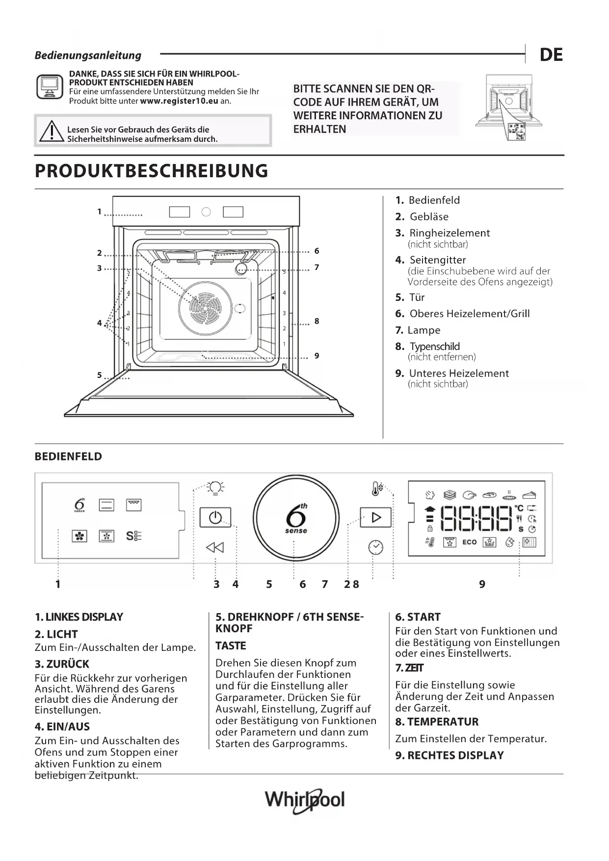 Für eine umfassendere Unterstützung melden Sie Ihr Produkt bitte unter www.register10.eu an. Lesen Sie vor Gebrauch des Geräts die Sicherheitshinweise aufmerksam durch. PRODUKTBESCHREIBUNG BEDIENFELD