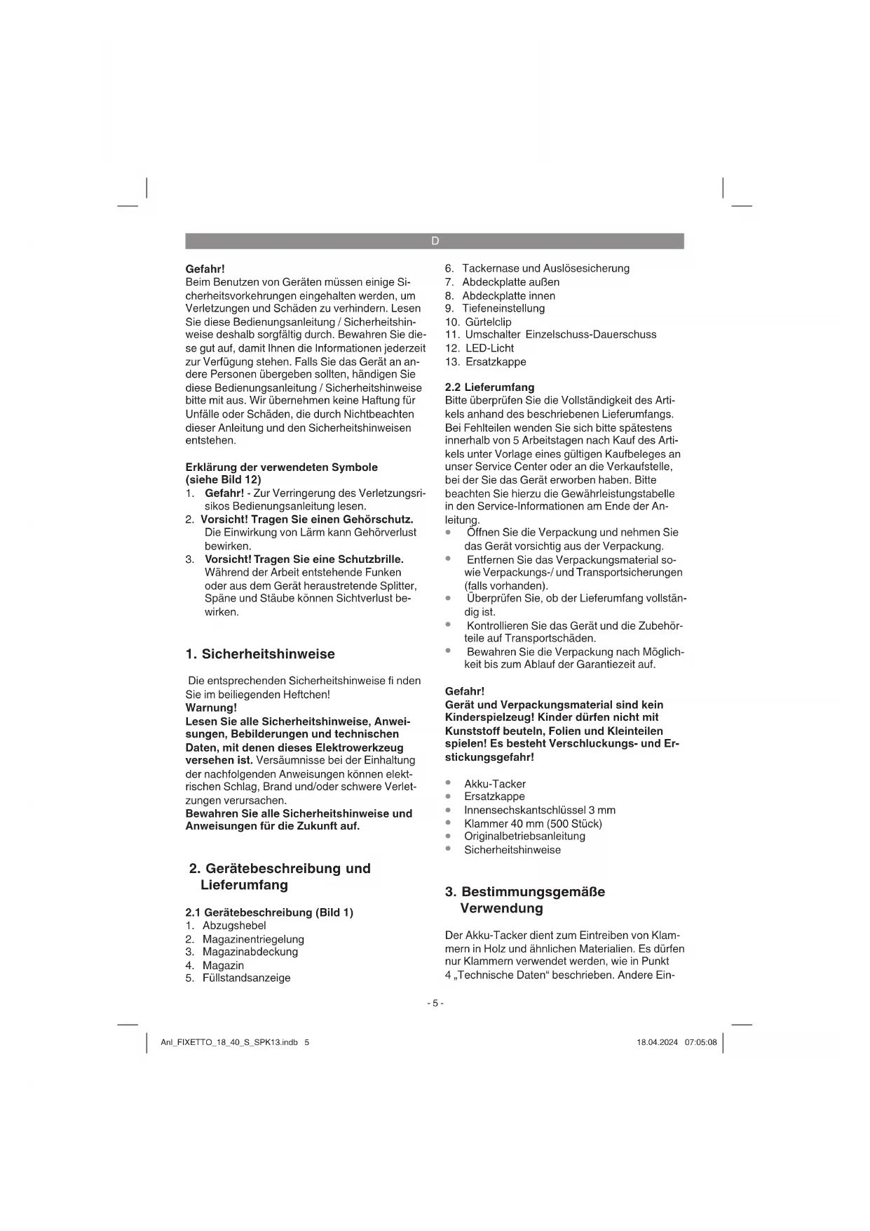 Verwendung Der Akku-Tacker dient zum Eintreiben von Klam- mern in Holz und ähnlichen Materialien. Es dürfen nur Klammern verwendet werden, wie in Punkt 4 „Technische Daten“ beschrieben. Andere Ein- Anl_FIXETTO_18_40_S_SPK13.indb 5Anl_FIXETTO_18_40_S_SPK13.indb 5 18.04.2024 07:05:0818.04.2024 07:05:08D