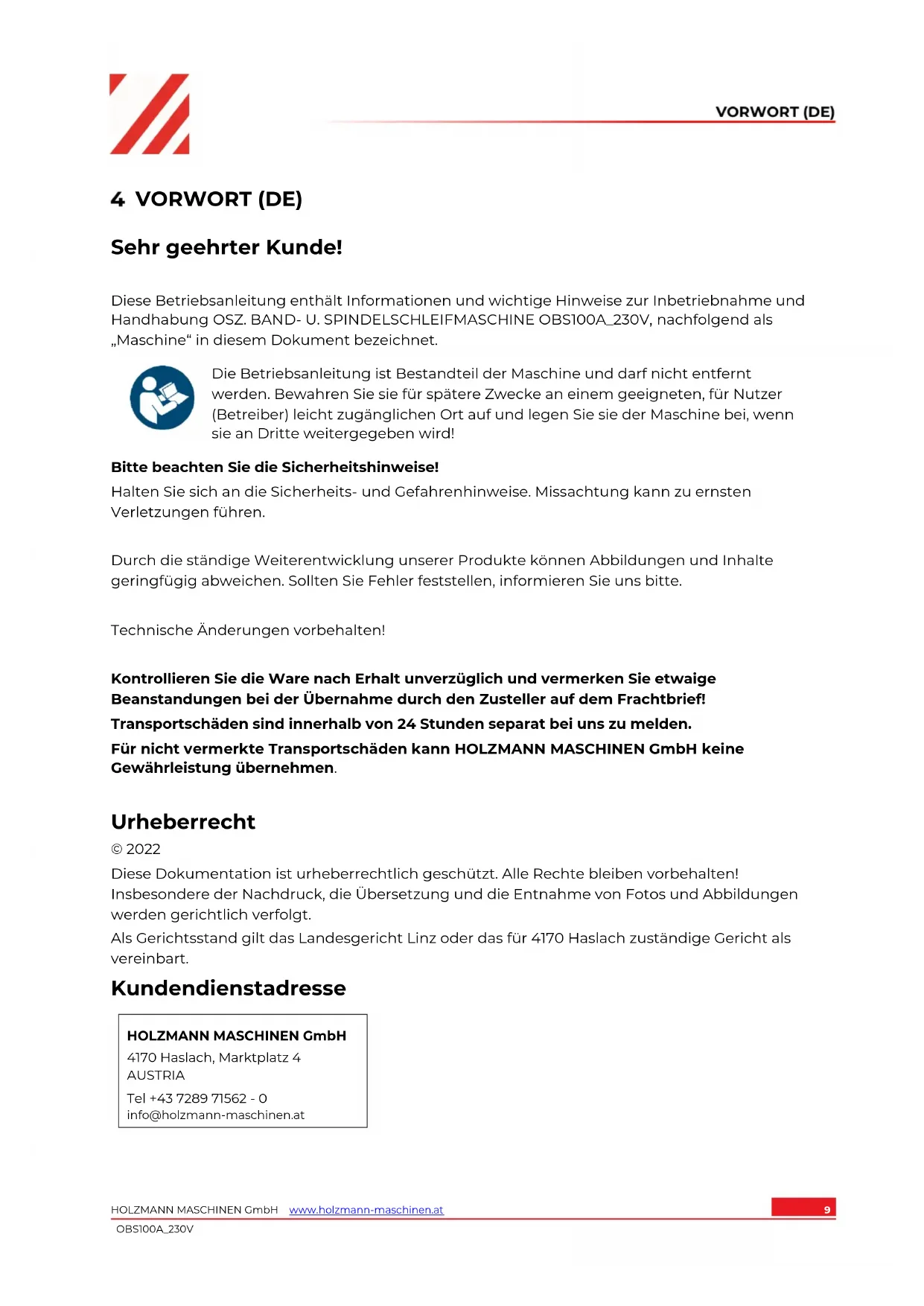 Die Betriebsanleitung ist Bestandteil der Maschine und darf nicht entfernt werden. Bewahren Sie sie für spätere Zwecke an einem geeigneten, für Nutzer (Betreiber) leicht zugänglichen Ort auf und legen Sie sie der Maschine bei, wenn sie an Dritte weitergegeben wird! Bitte beachten Sie die Sicherheitshinweise! Halten Sie sich an die Sicherheits- und Gefahrenhinweise. Missachtung kann zu ernsten Verletzungen führen. Durch die ständige Weiterentwicklung unserer Produkte können Abbildungen und Inhalte geringfügig abweichen. Sollten Sie Fehler feststellen, informieren Sie uns bitte. Technische Änderungen vorbehalten! Kontrollieren Sie die Ware nach Erhalt unverzüglich und vermerken Sie etwaige Beanstandungen bei der Übernahme durch den Zusteller auf dem Frachtbrief! Transportschäden sind innerhalb von 24 Stunden separat bei uns zu melden. Für nicht vermerkte Transportschäden kann HOLZMANN MASCHINEN GmbH keine Gewährleistung übernehmen. Urheberrecht © 2022 Diese Dokumentation ist urheberrechtlich geschützt. Alle Rechte bleiben vorbehalten! Insbesondere der Nachdruck, die Übersetzung und die Entnahme von Fotos und Abbildungen werden gerichtlich verfolgt. Als Gerichtsstand gilt das Landesgericht Linz oder das für 4170 Haslach zuständige Gericht als vereinbart. Kundendienstadresse
