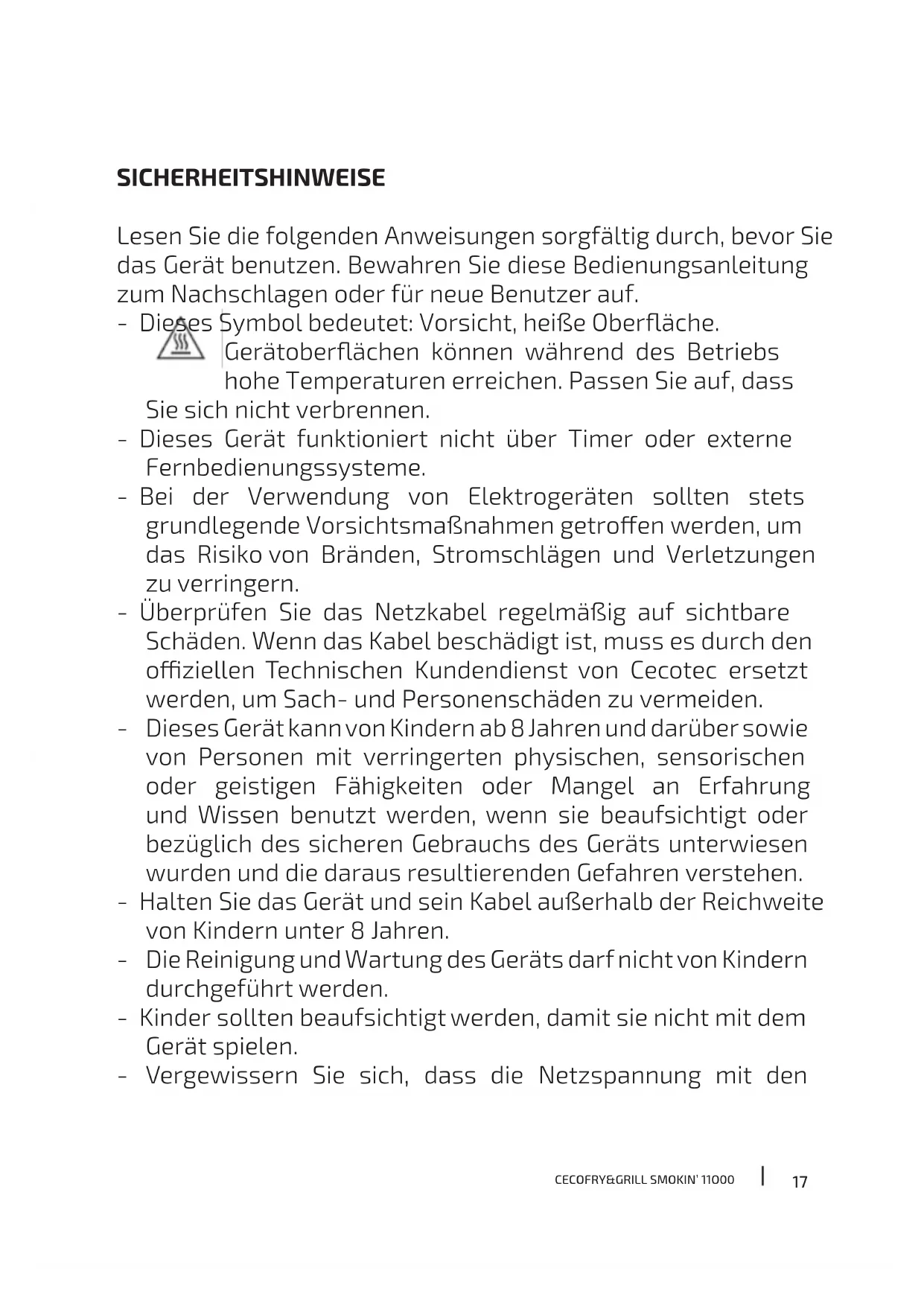 SICHERHEITSHINWEISE Lesen Sie die folgenden Anweisungen sorgfältig durch, bevor Sie das Gerät benutzen. Bewahren Sie diese Bedienungsanleitung zum Nachschlagen oder für neue Benutzer auf. - Dieses Symbol bedeutet: Vorsicht, heiße Oberäche. Gerätoberächen können während des Betriebs hohe Temperaturen erreichen. Passen Sie auf, dass Sie sich nicht verbrennen. - Dieses Gerät funktioniert nicht über Timer oder externe Fernbedienungssysteme. - Bei der Verwendung von Elektrogeräten sollten stets grundlegende Vorsichtsmaßnahmen getroen werden, um das Risiko von Bränden, Stromschlägen und Verletzungen zu verringern. - Überprüfen Sie das Netzkabel regelmäßig auf sichtbare Schäden. Wenn das Kabel beschädigt ist, muss es durch den oziellen Technischen Kundendienst von Cecotec ersetzt werden, um Sach- und Personenschäden zu vermeiden. - Dieses Gerät kann von Kindern ab 8 Jahren und darüber sowie von Personen mit verringerten physischen, sensorischen oder geistigen Fähigkeiten oder Mangel an Erfahrung und Wissen benutzt werden, wenn sie beaufsichtigt oder bezüglich des sicheren Gebrauchs des Geräts unterwiesen wurden und die daraus resultierenden Gefahren verstehen. - Halten Sie das Gerät und sein Kabel außerhalb der Reichweite von Kindern unter 8 Jahren. - Die Reinigung und Wartung des Geräts darf nicht von Kindern durchgeführt werden. - Kinder sollten beaufsichtigt werden, damit sie nicht mit dem Gerät spielen. - Vergewissern Sie sich, dass die Netzspannung mit denCECOFRY&GRILL SMOKIN’ 11O00