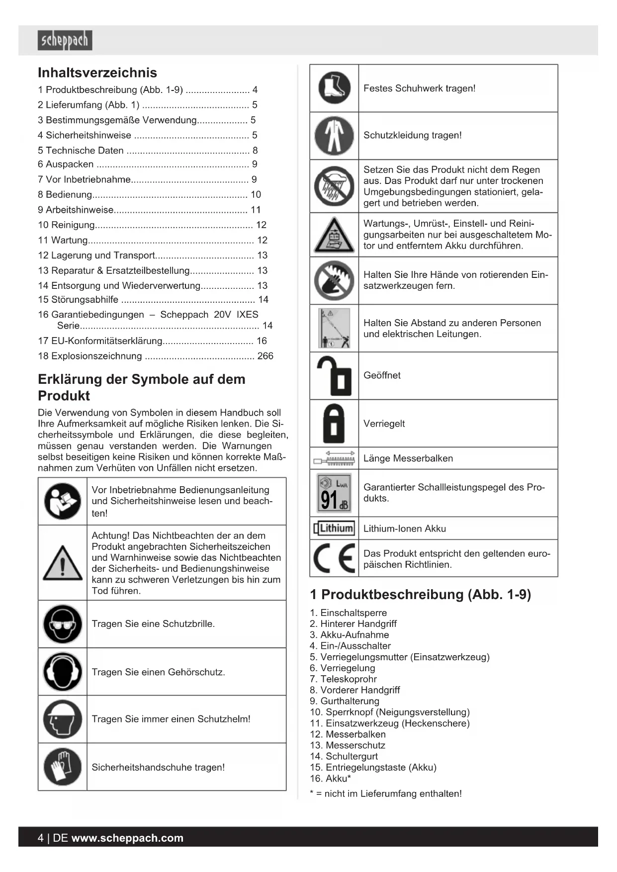 - 3www.scheppach.comInhaltsverzeichnis 1 Produktbeschreibung (Abb. 1-9) p. 4