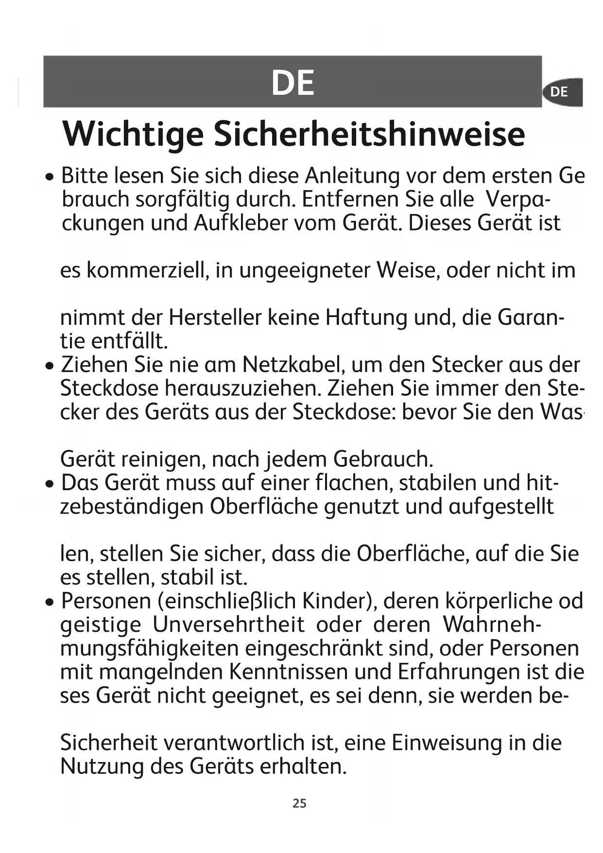 - Das Gerät darf von Kindern ab 8 Jahren und Perso- nen, deren körperliche oder geistige Unversehrtheit oder deren Wahrnehmungsfähigkeit eingeschränkt ist, oder Personen mit mangelnden Kenntnissen und Erfahrungen benutzt werden, sofern sie beaufsichtigt werde noder eine Einweisung in den sicheren Ge- brauch des Geräts erhalten haben und die damit ver- bundenen Risiken verstehen. Kindern muss das Spie- len mit dem Gerät untersagt werden. Reinigungs- und Wartungsmaßnahmen durfen nicht von Kindern ausgefuhrt werden, außer wenn sie mindestens 8 Jah- re alt sind und beaufsichtigt werden. Achten Sie da- rauf, dass das Gerät und die Netzschnur außerhalb der Reichweite von Kinder nunter 8 Jahren sind.