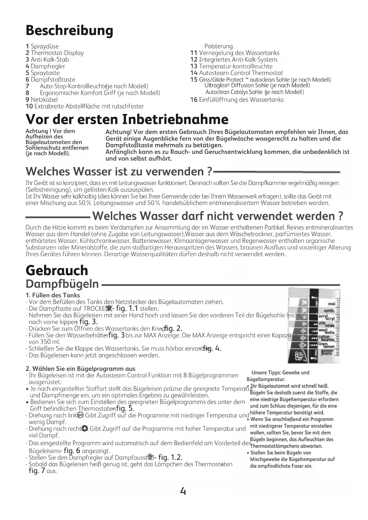 fig. 7 aus. Achtung ! Vor demAufheizen desBügelautomaten denSohlenschutz entfernen(je nach Modell).1 Spraydüse2 Thermostat-Display3 Anti-Kalk-Stab4 Dampfregler5 Spraytaste6 Dampfstoßtaste Auto-Stop-Kontrollleuchte(je nach Modell) Ergonomischer Komfort Griff (je nach Modell)9 Netzkabel10 Extrabreite Abstellfläche mit rutschfesterPolsterung11 Verriegelung des Wassertanks12 Integriertes Anti-Kalk-System13 Temperatur-kontrollleuchte14 Autosteam Control Thermostat 15 Gliss/Glide Protect ™ autoclean Sohle (je nach Modell)Ultragliss Diffusion Sohle (je nach Modell)Autoclean Catalys Sohle je nach Modell 16 Einfüllöffnung des Wassertanks Unsere Tipps: Gewebe undBügeltemperatur:• Ihr Bügelautomat wird schnell heiß.Bügeln Sie deshalb zuerst die Stoffe, dieeine niedrige Bügeltemperatur erfordernund zum Schluss diejenigen, für die einehöhere Temperatur benötigt wird.• Wenn Sie anschließend ein Programmmit niedrigerer Temperatur einstellenwollen, sollten Sie, bevor Sie mit demBügeln beginnen, das Aufleuchten desThermostatlämpchens abwarten.• Stellen Sie beim Bügeln vonMischgewebe die Bügeltemperatur aufdie empfindlichste Faser ein. 1800135516 FV95XX E2_110x154 26/01/15 14:45 Page45