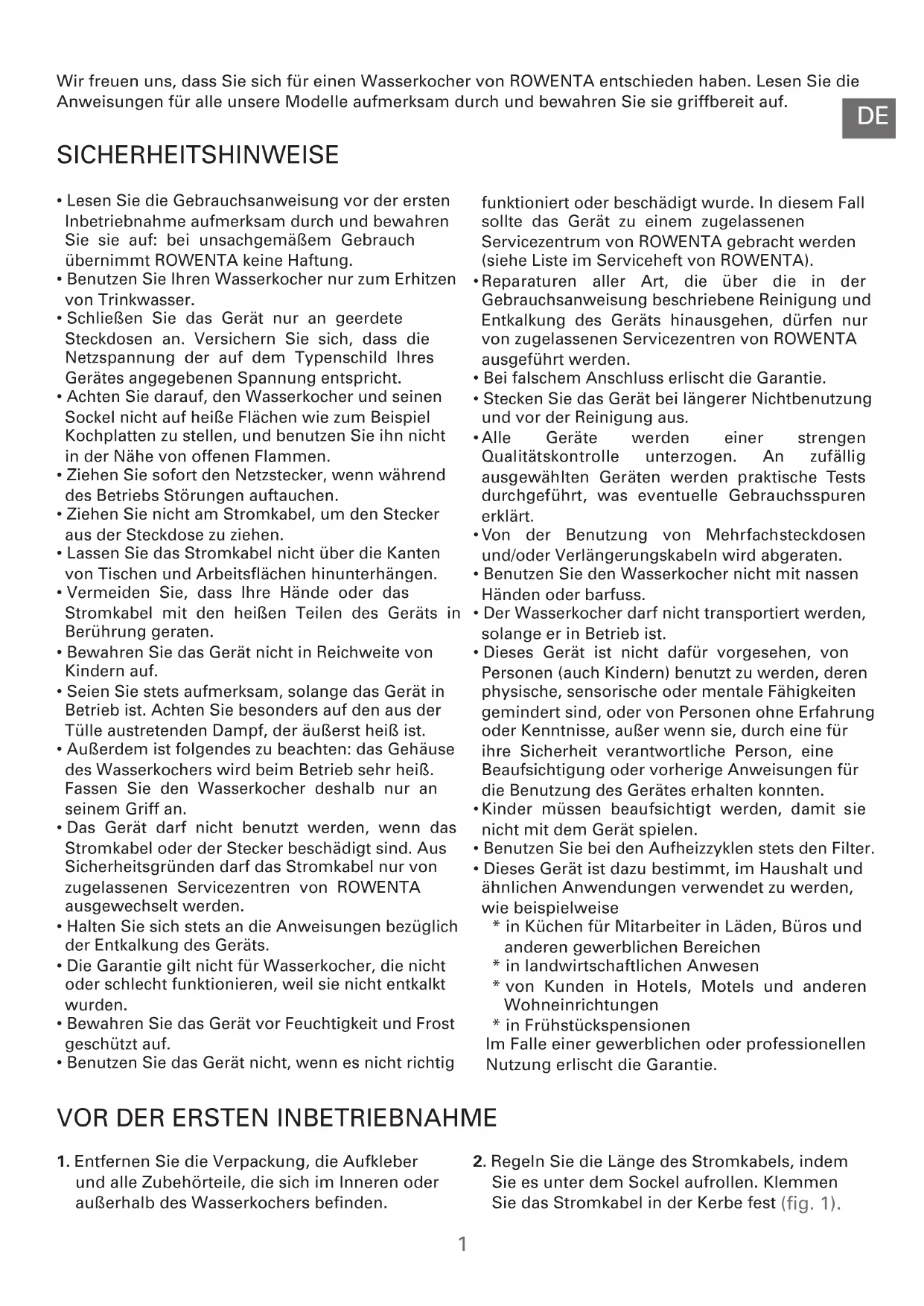 Wir freuen uns, dass Sie sich für einen Wasserkocher von ROWENTA entschieden haben. Lesen Sie die Anweisungen für alle unsere Modelle aufmerksam durch und bewahren Sie sie griffbereit auf. SICHERHEITSHINWEISE