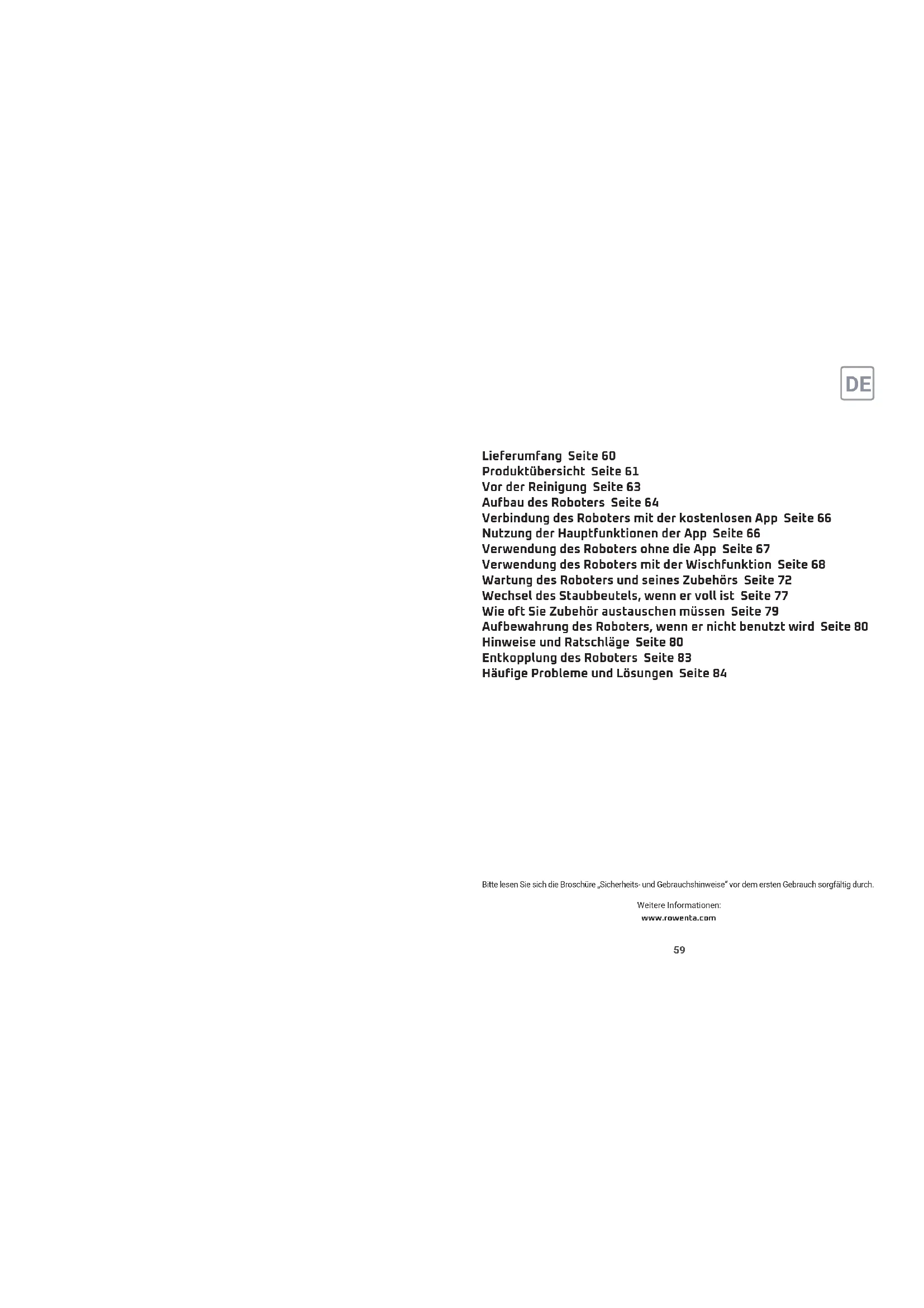 Lieferumfang Seite 60 Produktübersicht Seite 61 Vor der Reinigung Seite 63 Aufbau des Roboters Seite 64 Verbindung des Roboters mit der kostenlosen App Seite 66 Nutzung der Hauptfunktionen der App Seite 66 Verwendung des Roboters ohne die App Seite 67 Verwendung des Roboters mit der Wischfunktion Seite 68 Wartung des Roboters und seines Zubehörs Seite 72 Wechsel des Staubbeutels, wenn er voll ist Seite 77 Wie oft Sie Zubehör austauschen müssen Seite 79 Aufbewahrung des Roboters, wenn er nicht benutzt wird Seite 80 Hinweise und Ratschläge Seite 80 Entkopplung des Roboters Seite 83 Häuge Probleme und Lösungen Seite 84 Weitere Informationen: www.rowenta.com Bitte lesen Sie sich die Broschüre „Sicherheits- und Gebrauchshinweise“ vor dem ersten Gebrauch sorgfältig durch.60 61 Lieferumfang