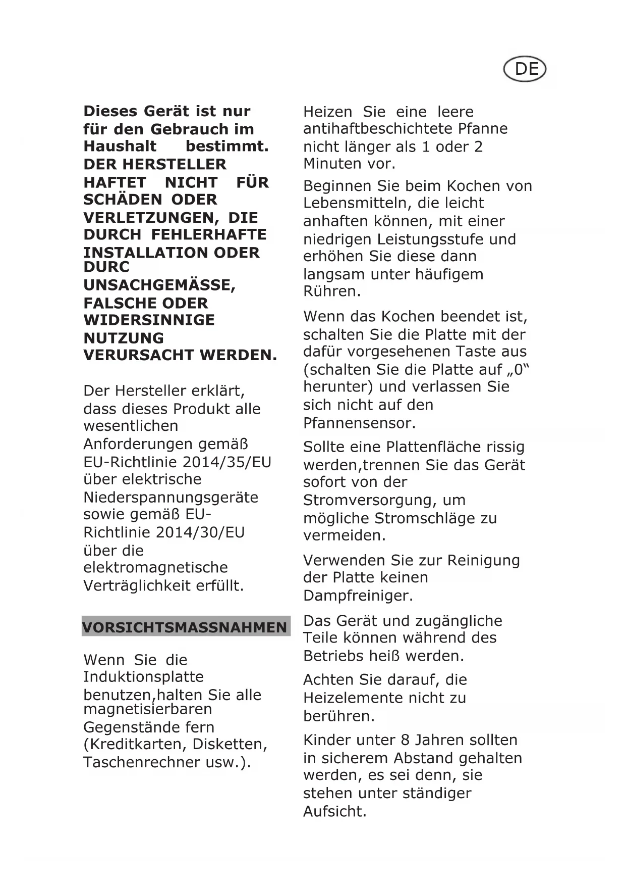 VERLETZUNGEN, DIE DURCH FEHLERHAFTE INSTALLATION ODER DURC UNSACHGEMÄSSE, FALSCHE ODER WIDERSINNIGE NUTZUNG VERURSACHT WERDEN. Der Hersteller erklärt, dass dieses Produkt alle wesentlichen Anforderungen gemäß EU-Richtlinie 2014/35/EU über elektrische Niederspannungsgeräte sowie gemäß EU- Richtlinie 2014/30/EU über die elektromagnetische Verträglichkeit erfüllt. VORSICHTSMASSNAHMEN Wenn Sie die Induktionsplatte benutzen,halten Sie alle magnetisierbaren Gegenstände fern (Kreditkarten, Disketten, Taschenrechner usw.). Heizen Sie eine leere antihaftbeschichtete Pfanne nicht länger als 1 oder 2 Minuten vor. Beginnen Sie beim Kochen von Lebensmitteln, die leicht anhaften können, mit einer niedrigen Leistungsstufe und erhöhen Sie diese dann langsam unter häufigem Rühren. Wenn das Kochen beendet ist, schalten Sie die Platte mit der dafür vorgesehenen Taste aus (schalten Sie die Platte auf „0“ herunter) und verlassen Sie sich nicht auf den Pfannensensor. Sollte eine Plattenfläche rissig werden,trennen Sie das Gerät sofort von der Stromversorgung, um mögliche Stromschläge zu vermeiden. Verwenden Sie zur Reinigung der Platte keinen Dampfreiniger. Das Gerät und zugängliche Teile können während des Betriebs heiß werden. Achten Sie darauf, die Heizelemente nicht zu berühren. Kinder unter 8 Jahren sollten in sicherem Abstand gehalten werden, es sei denn, sie stehen unter ständiger Aufsicht. DEKinder über 8 Jahren und Personen mit eingeschränkten körperlichen, sensorischen oder geistigen Fähigkeiten bzw. mangelnder Erfahrung oder Kenntnissen dürfen dieses Gerät verwenden, wenn sie beaufsichtigt werden, entsprechende Anweisungen zur sicheren Verwendung des Geräts erhalten haben und die damit verbundenen Gefahren verstehen. Kinder dürfen nicht mit dem Gerät spielen. Kinder dürfen das Gerät nur dann reinigen und benutzen, wenn sie unter ständiger Aufsicht stehen. Unbeaufsichtigtes Kochen mit Fett oder Öl kann gefährlich sein und einen Brand verursachen. Versuchen Sie NIEMALS, einen Brand mit Wasser zu löschen. Schalten Sie stattdessen das Gerät aus und ersticken Sie dann die Flammen z.B. mit einem Deckel oder einer Schale. -Jeder Kochprozess muss beaufsichtigt werden. Ein kurzer Kochprozess muss kontinuierlich überwacht werden. Unbeaufsichtigtes Kochen mit Fett oder Öl auf der Induktionsplatte kann gefährlich sein und zu einem Brand führen. Brandgefahr: Legen Sie keine Gegenstände auf den Kochflächen ab. Als geeigneter Schutz für die in das Gerät integrierte Arbeitsplatte sollten nur solche Arbeitsplattenschutzvorrichtung en verwendet werden, die für die Verwendung mit dem Kochgerät vorgesehen und in den Anweisungen des Herstellers aufgeführt sind. Die Verwendung ungeeigneter Schutzauflagen kann Unfälle verursachen. Legen Sie keine schweren Gegenstände auf die Platte und lassen nichts auf sie fallen. Verwenden Sie kein Kochgeschirr mit unregelmäßigen Kanten. Ziehen Sie das Kochgeschirr nicht über die Induktionsglasoberfläche, da dies das Glas zerkratzen kann. Personen, die einen Herzschrittmacher oder andere elektrische Implantate (wie z.B. Insulinpumpen) tragen, sollten vor der Verwendung dieses Geräts ihren Arzt oder den Hersteller des Implantats konsultieren, um sicherzustellen, dass ihre Implantate durch das elektromagnetische Feld nicht beeinträchtigt werden. WARNUNG: Zugängliche Teile könnenheiß sein, wenn das Gerät in Betrieb ist. DEKinder sollten ferngehalten werden, um Verbrennungen oder Verbrühungen zu vermeiden. - Bauen Sie in die ortsfeste Installation eine Vorrichtung zur Unterbrechung der Stromversorgung mit allpoliger Kontakttrennung ein. Diese muss eine vollständige Trennung unter Überspannungskategorie- III-Bedingungen gemäß den Verkabelungsvorschriften gewährleisten. Der Stecker oder der allpolige Schalter der installierten Geräte muss leicht zugänglich sein. - Dieses Gerät ist nicht zur Steuerung durch einen externen Timer oder ein Fernsteuerungssystem vorgesehen. - Die Hersteller lehnen jede Haftung ab, falls die oben genannten Punkte oder die Unfallverhütungsvorschriften nicht beachtet oder eingehalten werden. Informationen über den Induktionsherd (F1)