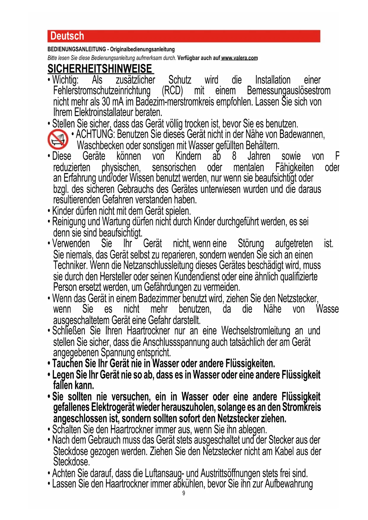 VALERA is a registered trade mark of LIGO PATENTS SA - SwitzerlandDeutsch BEDIENUNGSANLEITUNG - Originalbedienungsanleitung Bitte lesen Sie diese Bedienungsanleitung aufmerksam durch. Verfügbar auch auf www.valera.com SICHERHEITSHINWEISE