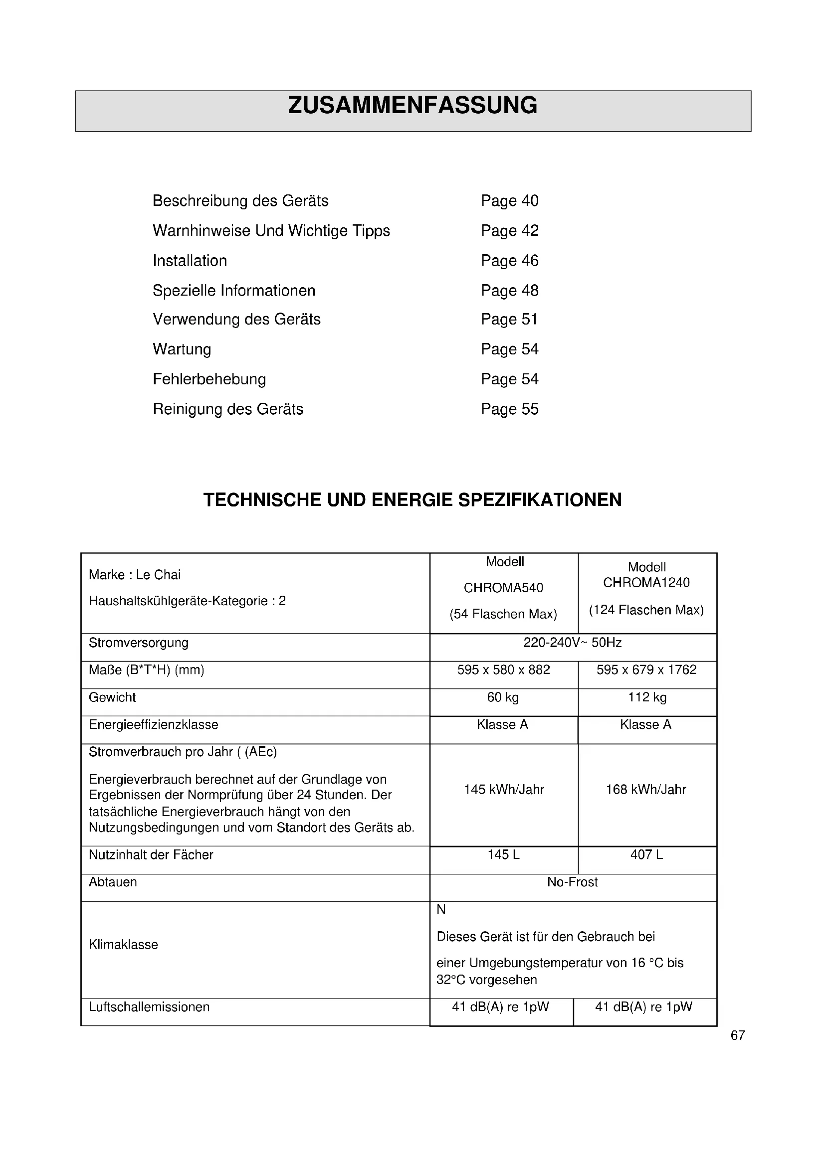 CHROMA 540 - Weinkeller LE CHAI - Kostenlose Bedienungsanleitung
