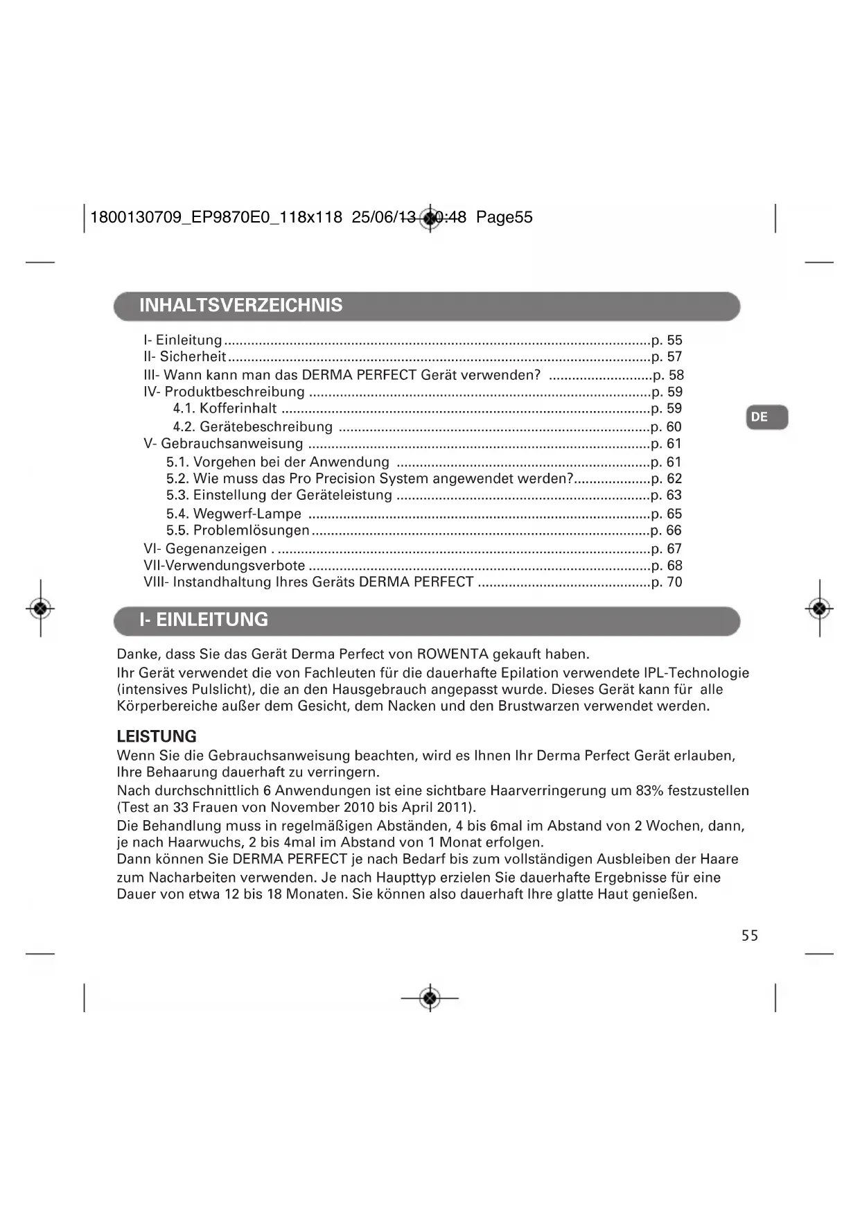 I- Einleitung...............................................................................................................p. 55 II- Sicherheit..............................................................................................................p. 57 III- Wann kann man das DERMA PERFECT Gerät verwenden? ...........................p. 58 IV- Produktbeschreibung .........................................................................................p. 59 4.1. Kofferinhalt ................................................................................................p. 59 4.2. Gerätebeschreibung .................................................................................p. 60 V- Gebrauchsanweisung .........................................................................................p. 61 5.1. Vorgehen bei der Anwendung ..................................................................p. 61 5.2. Wie muss das Pro Precision System angewendet werden?....................p. 62 5.3. Einstellung der Geräteleistung ..................................................................p. 63 5.4. Wegwerf-Lampe .........................................................................................p. 65 5.5. Problemlösungen........................................................................................p. 66 VI- Gegenanzeigen ...................................................................................................p. 67 VII-Verwendungsverbote .........................................................................................p. 68 VIII- Instandhaltung Ihres Geräts DERMA PERFECT .............................................p. 70 Danke, dass Sie das Gerät Derma Perfect von ROWENTA gekauft haben. Ihr Gerät verwendet die von Fachleuten für die dauerhafte Epilation verwendete IPL-Technologie (intensives Pulslicht), die an den Hausgebrauch angepasst wurde. Dieses Gerät kann für alle Körperbereiche außer dem Gesicht, dem Nacken und den Brustwarzen verwendet werden. LEISTUNG Wenn Sie die Gebrauchsanweisung beachten, wird es Ihnen Ihr Derma Perfect Gerät erlauben, Ihre Behaarung dauerhaft zu verringern. Nach durchschnittlich 6 Anwendungen ist eine sichtbare Haarverringerung um 83% festzustellen (Test an 33 Frauen von November 2010 bis April 2011). Die Behandlung muss in regelmäßigen Abständen, 4 bis 6mal im Abstand von 2 Wochen, dann, je nach Haarwuchs, 2 bis 4mal im Abstand von 1 Monat erfolgen. Dann können Sie DERMA PERFECT je nach Bedarf bis zum vollständigen Ausbleiben der Haare zum Nacharbeiten verwenden. Je nach Haupttyp erzielen Sie dauerhafte Ergebnisse für eine Dauer von etwa 12 bis 18 Monaten. Sie können also dauerhaft Ihre glatte Haut genießen. INHALTSVERZEICHNIS I- EINLEITUNG 1800130709_EP9870E0_118x118 25/06/13 10:48 Page5556 SICHERHEIT Dieses Gerät wurde von Wissenschaftlern und praktizierenden Ärzten entwickelt und nach den strengsten Normen getestet. Ihr Gerät garantiert Ihnen optimale Sicherheit dank: