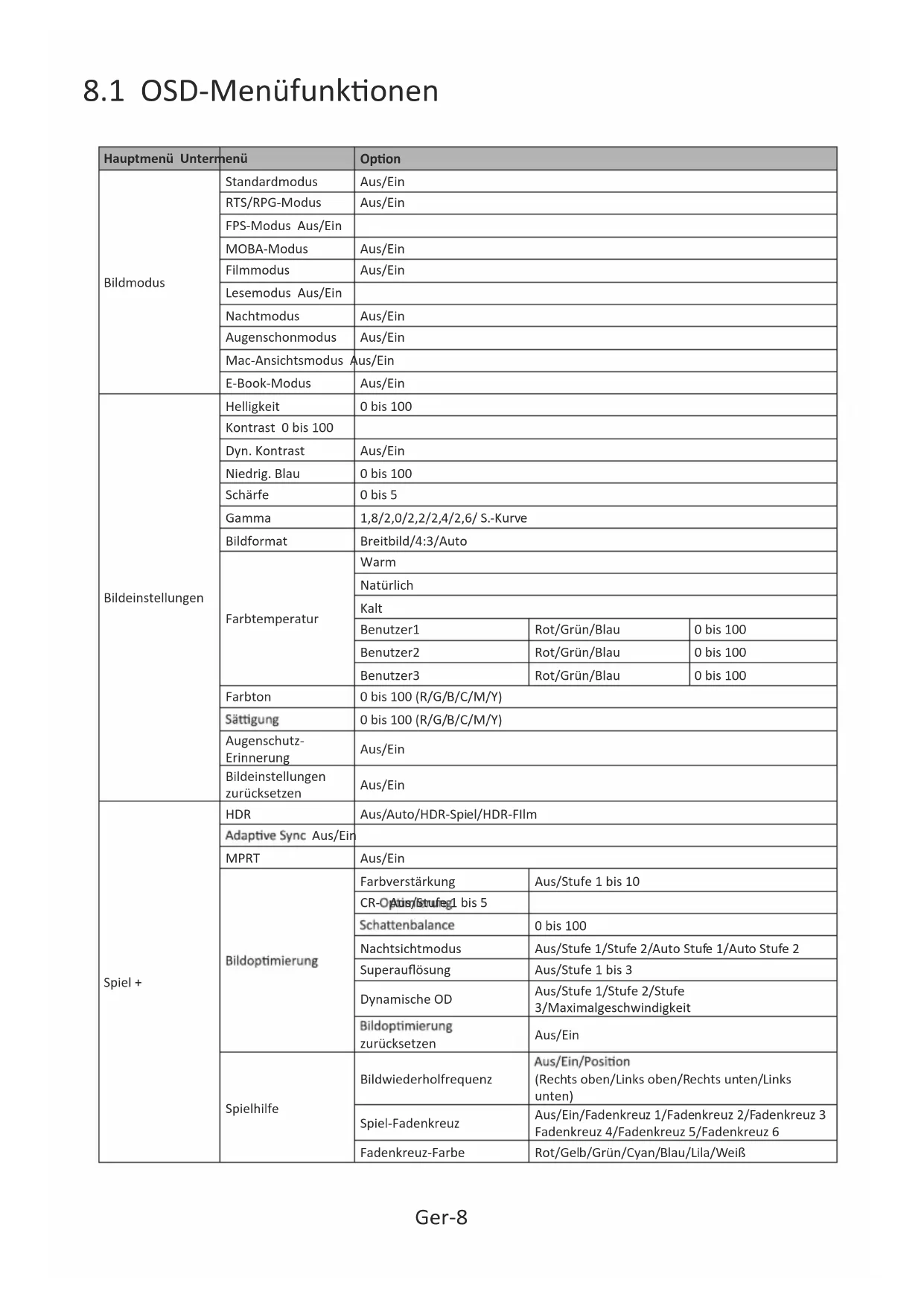 8.1 OSD-MenüfunkonenHauptmenü