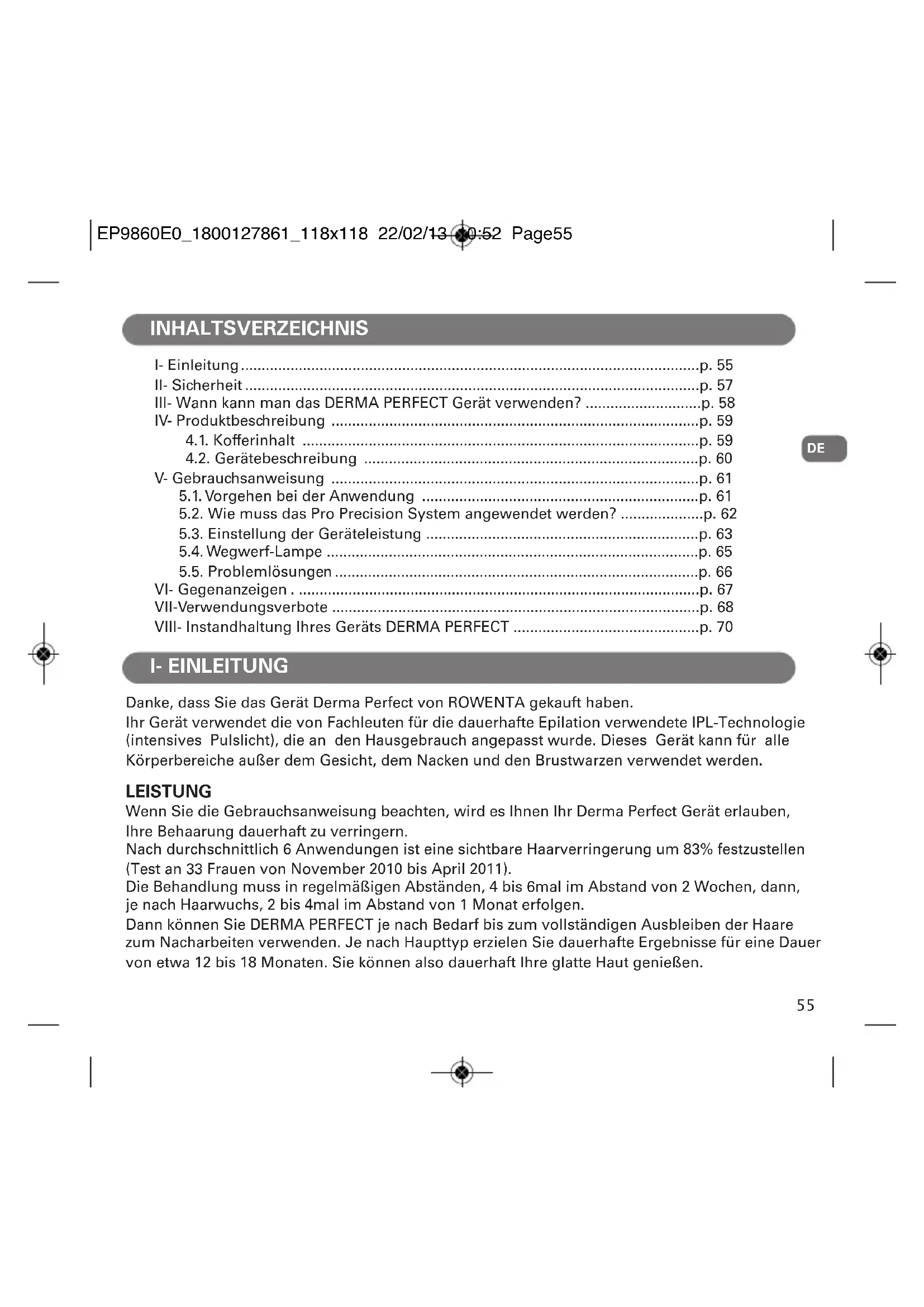 I- Einleitung...............................................................................................................p. 55 II- Sicherheit ..............................................................................................................p. 57 III- Wann kann man das DERMA PERFECT Gerät verwenden? ............................p. 58 IV- Produktbeschreibung .........................................................................................p. 59 4.1. Kofferinhalt ................................................................................................p. 59 4.2. Gerätebeschreibung .................................................................................p. 60 V- Gebrauchsanweisung .........................................................................................p. 61 5.1. Vorgehen bei der Anwendung ...................................................................p. 61 5.2. Wie muss das Pro Precision System angewendet werden? ....................p. 62 5.3. Einstellung der Geräteleistung ..................................................................p. 63 5.4. Wegwerf-Lampe ..........................................................................................p. 65 5.5. Problemlösungen ........................................................................................p. 66 VI- Gegenanzeigen ...................................................................................................p. 67 VII-Verwendungsverbote .........................................................................................p. 68 VIII- Instandhaltung Ihres Geräts DERMA PERFECT .............................................p. 70 Danke, dass Sie das Gerät Derma Perfect von ROWENTA gekauft haben. Ihr Gerät verwendet die von Fachleuten für die dauerhafte Epilation verwendete IPL-Technologie (intensives Pulslicht), die an den Hausgebrauch angepasst wurde. Dieses Gerät kann für alle Körperbereiche außer dem Gesicht, dem Nacken und den Brustwarzen verwendet werden. LEISTUNG Wenn Sie die Gebrauchsanweisung beachten, wird es Ihnen Ihr Derma Perfect Gerät erlauben, Ihre Behaarung dauerhaft zu verringern. Nach durchschnittlich 6 Anwendungen ist eine sichtbare Haarverringerung um 83% festzustellen (Test an 33 Frauen von November 2010 bis April 2011). Die Behandlung muss in regelmäßigen Abständen, 4 bis 6mal im Abstand von 2 Wochen, dann, je nach Haarwuchs, 2 bis 4mal im Abstand von 1 Monat erfolgen. Dann können Sie DERMA PERFECT je nach Bedarf bis zum vollständigen Ausbleiben der Haare zum Nacharbeiten verwenden. Je nach Haupttyp erzielen Sie dauerhafte Ergebnisse für eine Dauer von etwa 12 bis 18 Monaten. Sie können also dauerhaft Ihre glatte Haut genießen. INHALTSVERZEICHNIS I- EINLEITUNG EP9860E0_1800127861_118x118 22/02/13 10:52 Page5556 SICHERHEIT Dieses Gerät wurde von Wissenschaftlern und praktizierenden Ärzten entwickelt und nach den strengsten Normen getestet. Ihr Gerät garantiert Ihnen optimale Sicherheit dank: