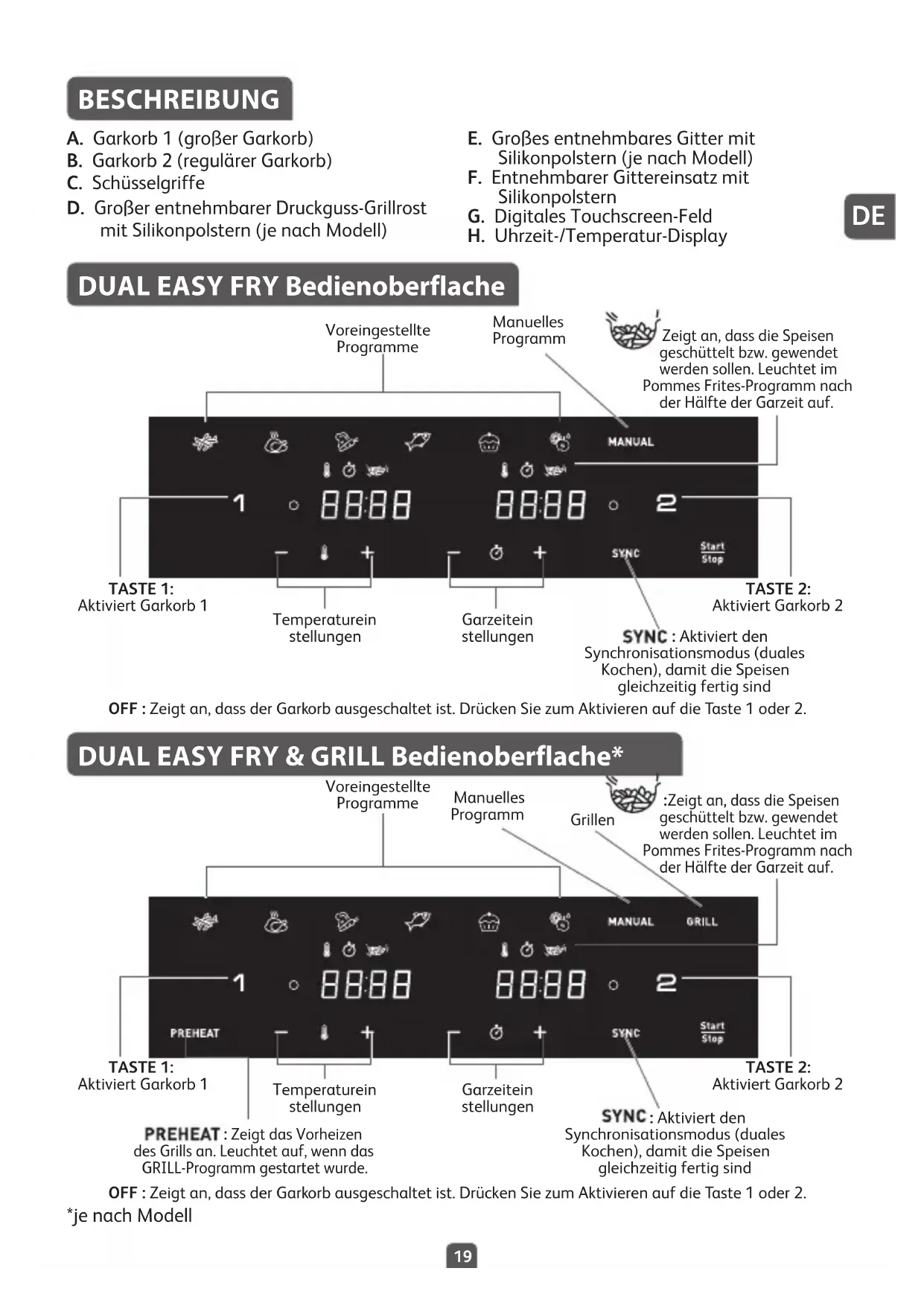 BESCHREIBUNG A. Garkorb 1 (großer Garkorb) B. Garkorb 2 (regulärer Garkorb) C. Schüsselgriffe D. Großer entnehmbarer Druckguss-Grillrost mit Silikonpolstern (je nach Modell) E. Großes entnehmbares Gitter mit Silikonpolstern (je nach Modell) F. Entnehmbarer Gittereinsatz mit Silikonpolstern G. Digitales Touchscreen-Feld H. Uhrzeit-/Temperatur-Display DUAL EASY FRY Bedienoberflache DUAL EASY FRY & GRILL Bedienoberflache* OFF : Zeigt an, dass der Garkorb ausgeschaltet ist. Drücken Sie zum Aktivieren auf die Taste 1 oder 2. : Zeigt das Vorheizen des Grills an. Leuchtet auf, wenn das GRILL-Programm gestartet wurde. *je nach Modell Voreingestellte Programme Zeigt an, dass die Speisen geschüttelt bzw. gewendet werden sollen. Leuchtet im Pommes Frites-Programm nach der Hälfte der Garzeit auf. Manuelles Programm : Aktiviert den Synchronisationsmodus (duales Kochen), damit die Speisen gleichzeitig fertig sind : Aktiviert den Synchronisationsmodus (duales Kochen), damit die Speisen gleichzeitig fertig sind Temperaturein stellungen Temperaturein stellungen Garzeitein stellungen Garzeitein stellungen TASTE 1: Aktiviert Garkorb 1 TASTE 1: Aktiviert Garkorb 1 TASTE 2: Aktiviert Garkorb 2 TASTE 2: Aktiviert Garkorb 2 Voreingestellte Programme