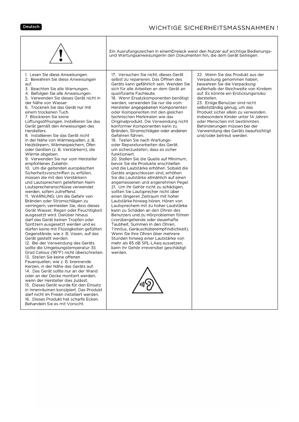 sollten Sie Lautsprecher nicht über einen längeren Zeitraum mit hoher Lautstärke hinweg hören. Hören von Lautsprechern mit zu hoher Lautstärke kann zu Schäden an den Ohren des Benutzers und zu Hörproblemen führen (vorübergehende oder dauerhafte Taubheit, Summen in den Ohren, Tinnitus, Geräuschüberempfindlichkeit). Wenn Sie Ihre Ohren über mehrere Stunden hinweg einer Lautstärke von mehr als 85dB SPL-LAeq aussetzen, kann Ihr Gehör irreversibel geschädigt werden.