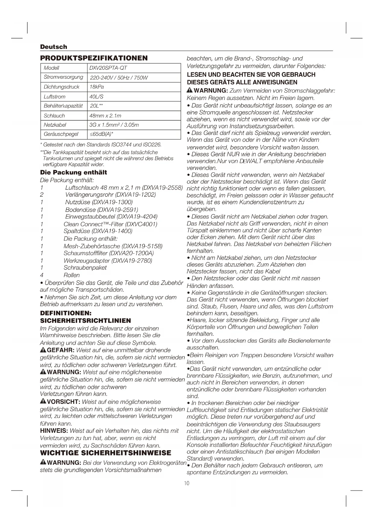 GARANTI PÅ ADVARSEL: Dette produkt skal IKKE bruges til ltrering af patogener, for eksempel COVID-19. Følg alle lokale, statslige og føderale retningslinjer om generel rengøringspraksis. Ekstra tilbehør ADVARSEL: Da der ikke er afprøvet andre tilbehørsdele end dem, som DEWALT tilbyder, med dette produkt, kan det være farligt at anvende sådant tilbehør med dette apparat. For at mindske risikoen for personskade må dette produkt kun anvendes med tilbehør, der anbefales af DEWALT.GEFAHR: Weist auf eine unmittelbar drohende gefährliche Situation hin, die, sofern sie nicht vermieden wird, zu tödlichen oder schweren Verletzungen führt. WARNUNG: Weist auf eine möglicherweise gefährliche Situation hin, die, sofern sie nicht vermieden wird, zu tödlichen oder schweren Verletzungen führen kann. VORSICHT: Weist auf eine möglicherweise gefährliche Situation hin, die, sofern sie nicht vermieden wird, zu leichten oder mittelschweren Verletzungen führen kann. HINWEIS: Weist auf ein Verhalten hin, das nichts mit Verletzungen zu tun hat, aber, wenn es nicht vermieden wird, zu Sachschäden führen kann. Die Packung enthält: 1 Luftschlauch 48 mm x 2,1 m (DXVA19-2558) 2 Verlängerungsrohr (DXVA19-1202) 1 Nutzdüse (DXVA19-1300) 1 Bodendüse (DXVA19-2591) 1 Einwegstaubbeutel (DXVA19-4204) 1 Clean Connect™-Filter (DXVC4001) 1 Spaltdüse (DXVA19-1400) 1 Die Packung enthält: 1 Mesh-Zubehörtasche (DXVA19-5158) 1 Schaumstofflter (DXVA20-1200A) 1 Werkzeugadapter (DXVA19-2780) 1 Schraubenpaket 4 Rollen