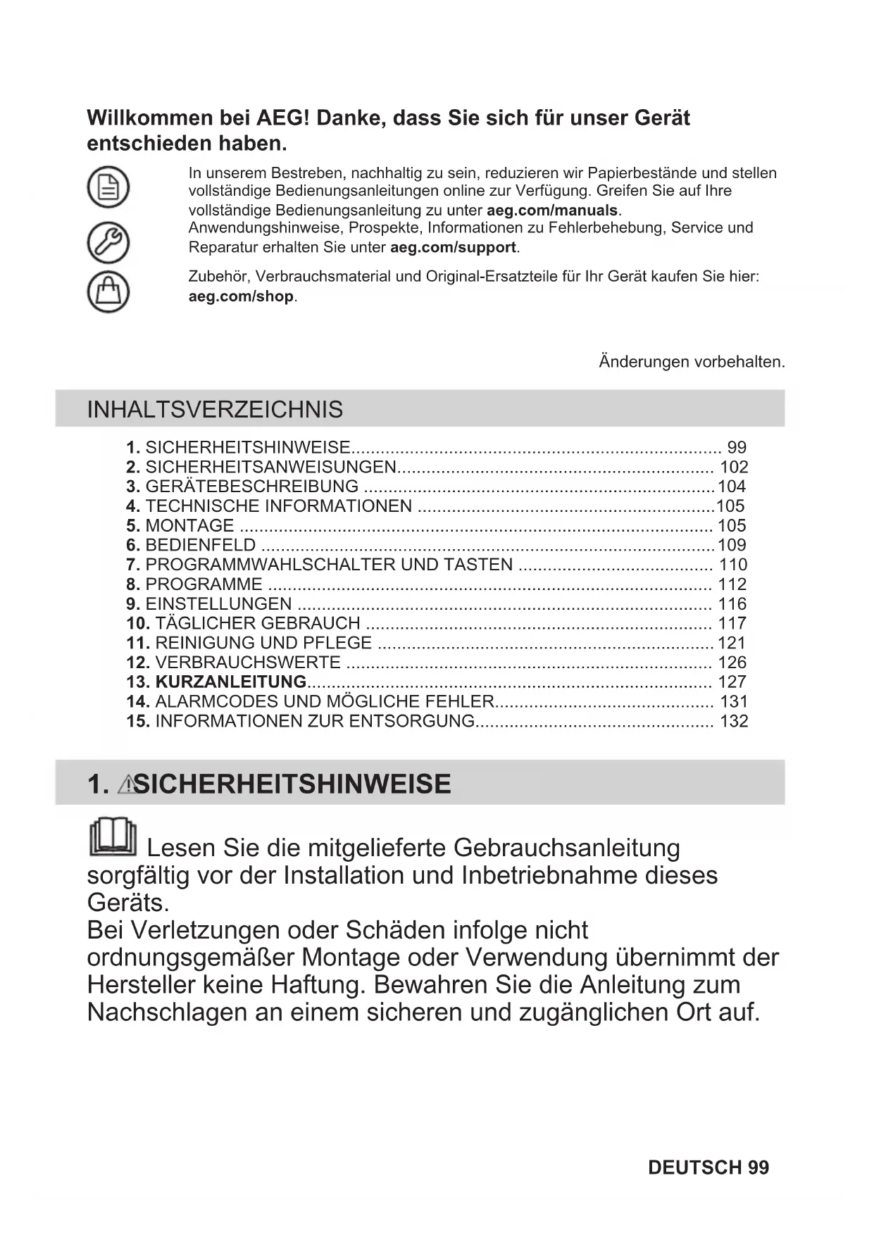 - Erhalten Sie Informationen zur Nutzung, Fehlerbehebung, Wartung und Reparatur (auch verfügbar un‐ ter aeg.com/support).