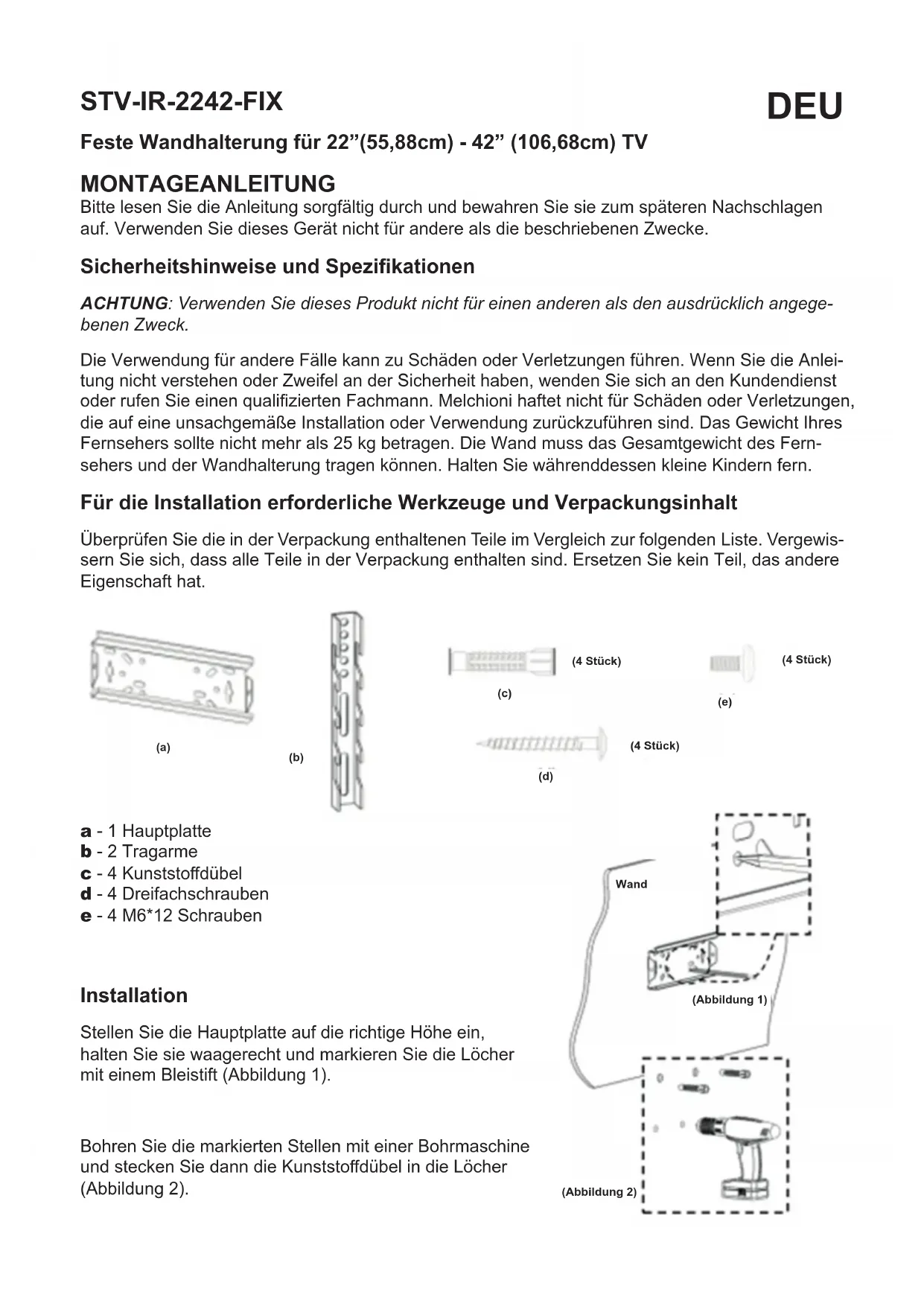 - interventions à domicile pour des contrôles de commodité ou des défauts présumés La reconnaissance de la garantie par Melchioni Spa est soumis à la présentation d’un document scal qui prouve la date réelle d’achat. Le même ne doit montrer aucune altération ou suppression, en présence de laquelle Melchioni Spa se réserve le droit de refuser la fourniture d’un traitement sous garantie. La garantie ne sera pas reconnue si le numéro de série ou le modèle de l’appareil est inexistant, abrasé ou modié. Cette garantie n’inclut aucun droit à une indemnisation pour les dommages directs ou indirects, de quelque nature que ce soit, aux personnes ou aux choses, causés par une inecacité de l’appareil. Toutes extensions, promesses ou prestations à cet égard, assurées par le revendeur, seront à la charge de ce dernier.STV-IR-2242-FIX Feste Wandhalterung für 22”(55,88cm) - 42” (106,68cm) TV MONTAGEANLEITUNG Bitte lesen Sie die Anleitung sorgfältig durch und bewahren Sie sie zum späteren Nachschlagen auf. Verwenden Sie dieses Gerät nicht für andere als die beschriebenen Zwecke. Sicherheitshinweise und Spezikationen ACHTUNG: Verwenden Sie dieses Produkt nicht für einen anderen als den ausdrücklich angege- benen Zweck. Die Verwendung für andere Fälle kann zu Schäden oder Verletzungen führen. Wenn Sie die Anlei- tung nicht verstehen oder Zweifel an der Sicherheit haben, wenden Sie sich an den Kundendienst oder rufen Sie einen qualizierten Fachmann. Melchioni haftet nicht für Schäden oder Verletzungen, die auf eine unsachgemäße Installation oder Verwendung zurückzuführen sind. Das Gewicht Ihres Fernsehers sollte nicht mehr als 25 kg betragen. Die Wand muss das Gesamtgewicht des Fern- sehers und der Wandhalterung tragen können. Halten Sie währenddessen kleine Kindern fern. Für die Installation erforderliche Werkzeuge und Verpackungsinhalt Überprüfen Sie die in der Verpackung enthaltenen Teile im Vergleich zur folgenden Liste. Vergewis- sern Sie sich, dass alle Teile in der Verpackung enthalten sind. Ersetzen Sie kein Teil, das andere Eigenschaft hat.
