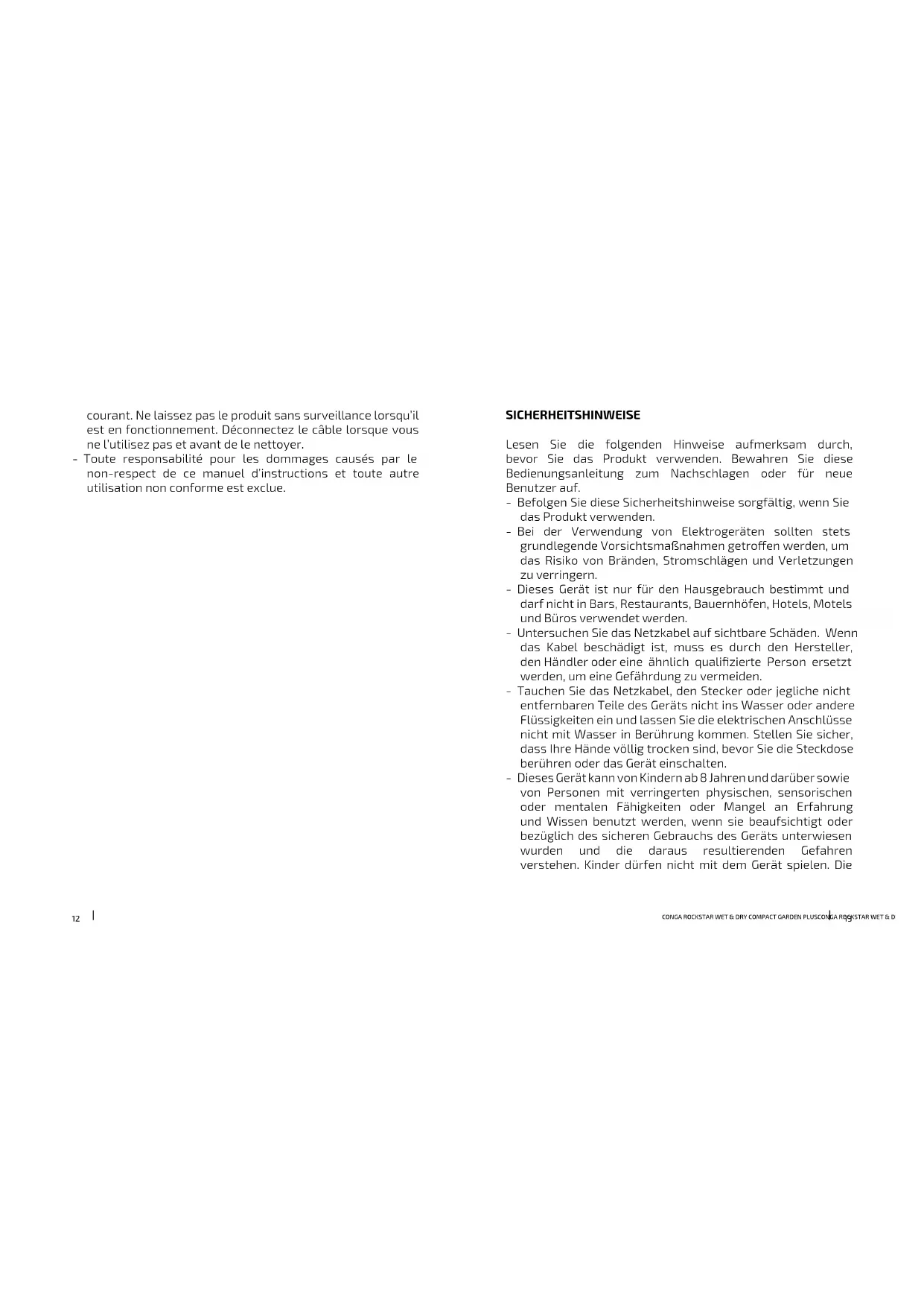 courant. Ne laissez pas le produit sans surveillance lorsqu’il est en fonctionnement. Déconnectez le câble lorsque vous ne l’utilisez pas et avant de le nettoyer. - Toute responsabilité pour les dommages causés par le non-respect de ce manuel d’instructions et toute autre utilisation non conforme est exclue. SICHERHEITSHINWEISE Lesen Sie die folgenden Hinweise aufmerksam durch, bevor Sie das Produkt verwenden. Bewahren Sie diese Bedienungsanleitung zum Nachschlagen oder für neue Benutzer auf. - Befolgen Sie diese Sicherheitshinweise sorgfältig, wenn Sie das Produkt verwenden. - Bei der Verwendung von Elektrogeräten sollten stets grundlegende Vorsichtsmaßnahmen getroen werden, um das Risiko von Bränden, Stromschlägen und Verletzungen zu verringern. - Dieses Gerät ist nur für den Hausgebrauch bestimmt und darf nicht in Bars, Restaurants, Bauernhöfen, Hotels, Motels und Büros verwendet werden. - Untersuchen Sie das Netzkabel auf sichtbare Schäden. Wenn das Kabel beschädigt ist, muss es durch den Hersteller, den Händler oder eine ähnlich qualizierte Person ersetzt werden, um eine Gefährdung zu vermeiden. - Tauchen Sie das Netzkabel, den Stecker oder jegliche nicht entfernbaren Teile des Geräts nicht ins Wasser oder andere Flüssigkeiten ein und lassen Sie die elektrischen Anschlüsse nicht mit Wasser in Berührung kommen. Stellen Sie sicher, dass Ihre Hände völlig trocken sind, bevor Sie die Steckdose berühren oder das Gerät einschalten. - Dieses Gerät kann von Kindern ab 8 Jahren und darüber sowie von Personen mit verringerten physischen, sensorischen oder mentalen Fähigkeiten oder Mangel an Erfahrung und Wissen benutzt werden, wenn sie beaufsichtigt oder bezüglich des sicheren Gebrauchs des Geräts unterwiesen wurden und die daraus resultierenden Gefahren verstehen. Kinder dürfen nicht mit dem Gerät spielen. DieCONGA ROCKSTAR WET & DRY COMPACT GARDEN PLUSCONGA ROCKSTAR WET & DRY COMPACT GARDEN PLUS