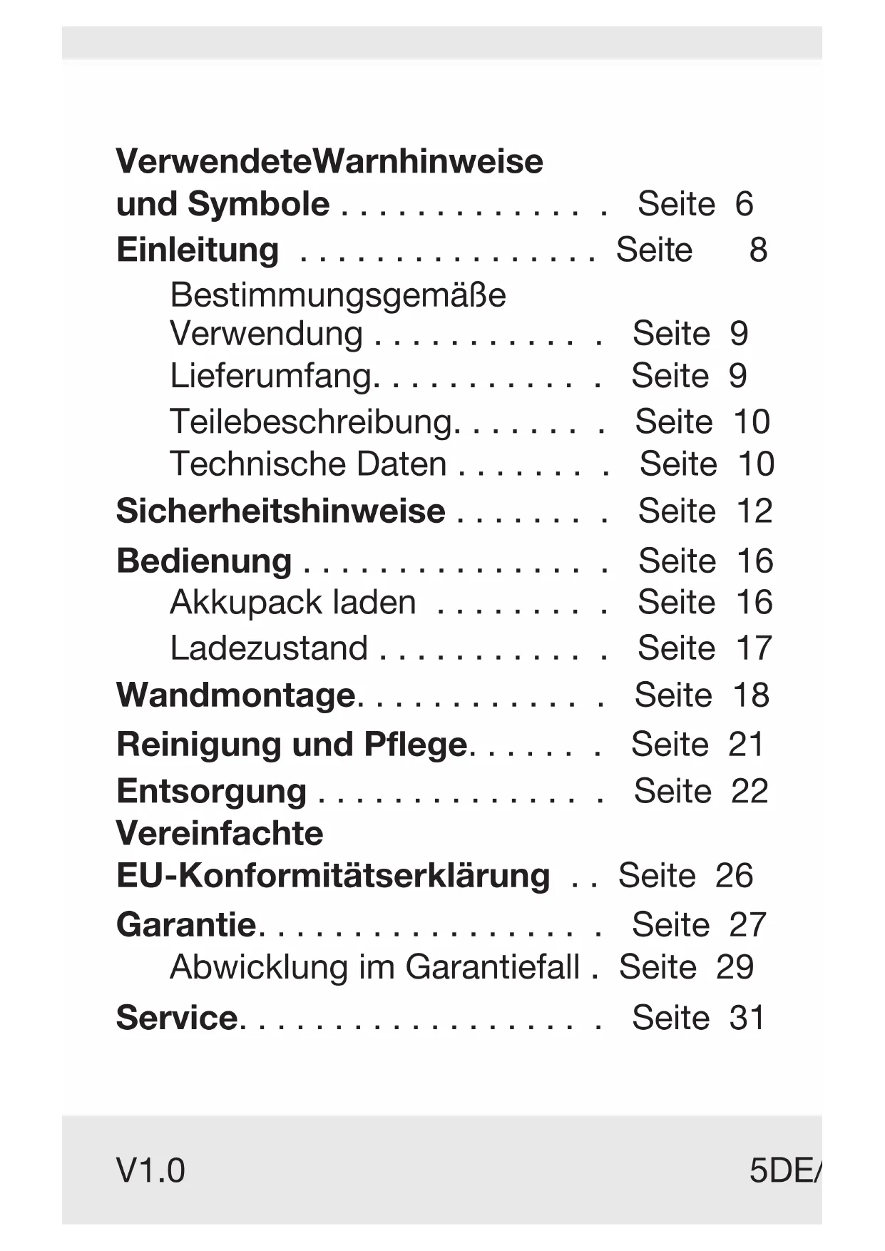 AAlle Parkside-Werkzeuge und die Ladegeräte PLG 20 A1/PLG 20 A2/PLG 20 A3/PLG 20 B1/ PLG 20 C3/PDSLG 20 A1 der X20 V-Team-Serie sind mit dem Akku-Pack PAP 20 A1/PAP 20 A2/ PAP 20 A3/PAP 20 B1/PAP 20 B3 kompatibel. All Parkside tools and the chargers PLG 20 A1/ PLG 20 A2/PLG 20 A3/PLG 20 B1/PLG 20 C3/ PDSLG 20 A1 of the X 20 V Team series are compatible with the PAP 20 A1/PAP 20 A2/ PAP 20 A3/PAP 20 B1/PAP 20 B3 battery pack. Tous les outils Parkside et chargeurs PLG 20 A1/ PLG 20 A2/PLG 20 A3/PLG 20 B1/PLG 20 C3/ PDSLG 20 A1de la série X20V-Team sont compatibles avec l‘accu PAP 20 A1/PAP 20 A2/ PAP 20 A3/PAP 20 B1/PAP 20 B3. Alle Parkside werktuigen en de opladers PLG 20 A1/PLG 20 A2/PLG 20 A3/PLG 20 B1/ PLG 20 C3/PDSLG 20 A1van de X20V-Teamserie zijn compatibel met accu‘s PAP 20 A1/PAP 20 A2/ PAP 20 A3/PAP 20 B1/PAP 20 B3. Wszystkie narzędzia rmy Parkside i ładowarki PLG 20 A1/PLG 20 A2/PLG 20 A3/PLG 20 B1/ PLG 20 C3/PDSLG 20 A1 z serii X20 V-Team są kompatybilne z akumulatorami PAP 20 A1/ PAP 20 A2/ PAP 20 A3/PAP 20 B1/PAP 20 B3. Všechny nástroje Parkside a nabíječky PLG 20 A1/ PLG 20 A2/PLG 20 A3/PLG 20 B1/ PLG 20 C3/ PDSLG 20 A1 týmové řady X20V jsou kompatibilní s akumulátorovou sadou PAP 20 A1/PAP 20 A2/ PAP 20 A3/PAP 20 B1/PAP 20 B3. Všetky nástroje Parkside a nabíjačky PLG 20 A1/ PLG 20 A2/PLG 20 A3/PLG 20 B1/ PLG 20 C3/ PDSLG 20 A1 zo série X20 V Team sú kompatibilné sakumulátorom PAP 20 A1/PAP 20 A2/ PAP 20 A3/ PAP 20 B1/PAP 20 B3.20 V max. 18 V Todas las herramientas Parkside y los cargadores PLG 20 A1/PLG 20 A2/PLG 20 A3/PLG 20 B1/ PLG 20 C3/PDSLG 20A1de la serie Team X20 V son compatibles con el paquete de baterías PAP 20 A1/PAP 20 A2/PAP 20 A3/PAP 20 B1/ PAP 20 B3. Alle Parkside-værktøjer og opladerne PLG 20 A1/ PLG 20 A2/PLG 20 A3/PLG 20 B1/ PLG 20 C3/ PDSLG 20 A1i X20V-Team-serien er kompatible med batteripakkerne PAP 20 A1/PAP 20 A2/ PAP 20 A3/PAP 20 B1/PAP 20 B3. Tutti gli utensili Parkside e i caricabatterie PLG 20 A1/PLG 20 A2/PLG 20 A3/PLG 20 B1/ PLG 20 C3/PDSLG 20A1della serie X20V-Team sono compatibili con la batteria PAP 20 A1/ PAP 20 A2/PAP 20 A3/PAP 20 B1/PAP 20 B3. Az X20V-Team sorozat minden Parkside szerszáma és töltője (PLG 20 A1/PLG 20 A2/PLG 20 A3/ PLG 20 B1/PLG 20 C3/PDSLG20A1)kompatibilis a PAP 20 A1/PAP 20 A2/PAP 20 A3/PAP 20 B1/ PAP 20 B3akkumulátorcsomaggal.6 B5DE/AT/CH Verwendete Warn hinweise und Symbole ............. . Seite 6 Einleitung ............... . Seite 8 Bestimmungsgemäße Verwendung ........... . Seite 9 Lieferumfang........... . Seite 9 Teilebeschreibung....... . Seite 10 Technische Daten ....... . Seite 10 Sicherheitshinweise ....... . Seite 12 Bedienung ............... . Seite 16 Akkupack laden ........ . Seite 16 Ladezustand ........... . Seite 17 Wandmontage............ . Seite 18 Reinigung und Pege...... . Seite 21 Entsorgung .............. . Seite 22 Vereinfachte EU-Konformitätserklärung . . Seite 26 Garantie ................. . Seite 27 Abwicklung im Garantiefall . Seite 29 Service.................. . Seite 31 V 1.06 DE/AT/CH Verwendete Warn hinweise und Symbole In dieser Bedienungsanleitung, auf der Verpackung und auf dem Typenschild werden die folgenden Warnhinweise verwendet: Lesen Sie die Bedienungsanleitung. Warn- und Sicherheitshinweise beachten! Verwenden Sie das Produkt nur in trockenen Innenräumen. Wechselstrom/-spannung Gleichstrom/-spannung7DE/AT/CH Schutzklasse II (Doppelisolierung) T3.15A Sicherung Dieses Symbol mit dem Signalwort „Info“ bietet weitere nützliche Informationen. Sicherheitshinweise und zusätzliche Informationen Handlungsanweisungen Das CE-Zeichen bestätigt Konformität mit den für das Produkt zutreenden EU-Richtlinien.8 DE/AT/CH