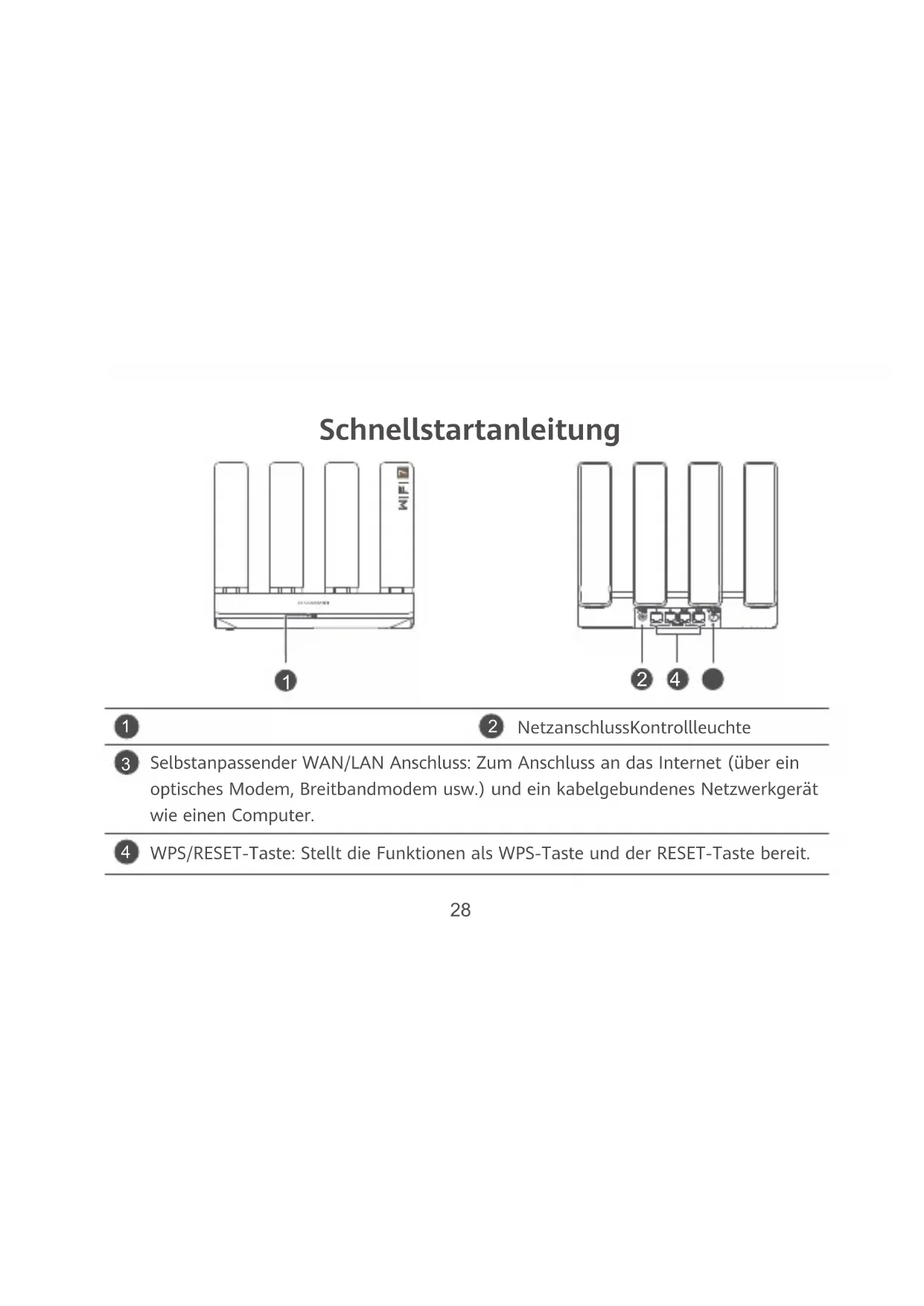 - Drahtlose Verbindung. Schritt 1: Platziere den hinzuzufügenden Router (neu oder auf Werkseinstellungen zurückgesetzt) maximal einen Meter von dem kongurierten HUAWEI WiFi BE3 Pro entfernt und verbinde ihn mit der Stromversorgung. Schritt 2: Wenn die Kontrollleuchte am HUAWEI WiFi BE3 Pro zu blinken beginnt, drücke dessen WPS/RESETTaste. Warte, bis die Kontrollleuchte am hinzuzufügenden Router anzeigt, dass eine Verbindung mit dem Netzwerk hergestellt wurde. „HUAWEI Router" bezieht sich auf Router, die HarmonyOS Mesh+ unterstützen. Bitte prüfen Sie, ob Ihr Gerät eine solche Funktion unterstützt. F4: Wie verbinde ich ein WLAN-Gerät mit meinem Router mithilfe von WPS? Wenn dein Router eingeschaltet ist, drücke auf dessen WPS/RESET-Taste und anschließend innerhalb von zwei Minuten auf die WPS-Taste auf dem WLAN-Gerät (wie einem Telefon), um die Standard- WPS-Aushandlung zu initiieren und das WLAN-Gerät mit dem WLAN-Netzwerk des Routers zu verbinden.36 Sicherheitsinformationen Betrieb und Sicherheit [Warnung] Bitte lies alle Sicherheitsinformationen sorgfältig durch, bevor du dein Gerät benutzt, um einen sicheren und ordnungsgemäßen Betrieb zu gewährleisten und um zu erfahren, wie du dein Gerät ordnungsgemäß entsorgen kannst.