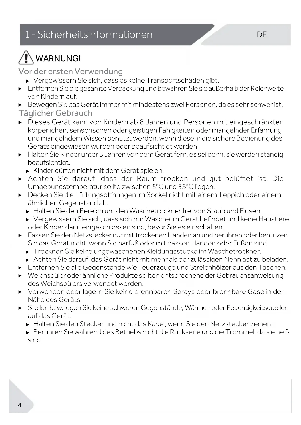 Fassen Sie den Netzstecker nur mit trockenen Händen an und berühren oder benutzen Sie das Gerät nicht, wenn Sie barfuß oder mit nassen Händen oder Füßen sind X Trocknen Sie keine ungewaschenen Kleidungsstücke im Wäschetrockner. X Achten Sie darauf, das Gerät nicht mit mehr als der zulässigen Nennlast zu beladen.