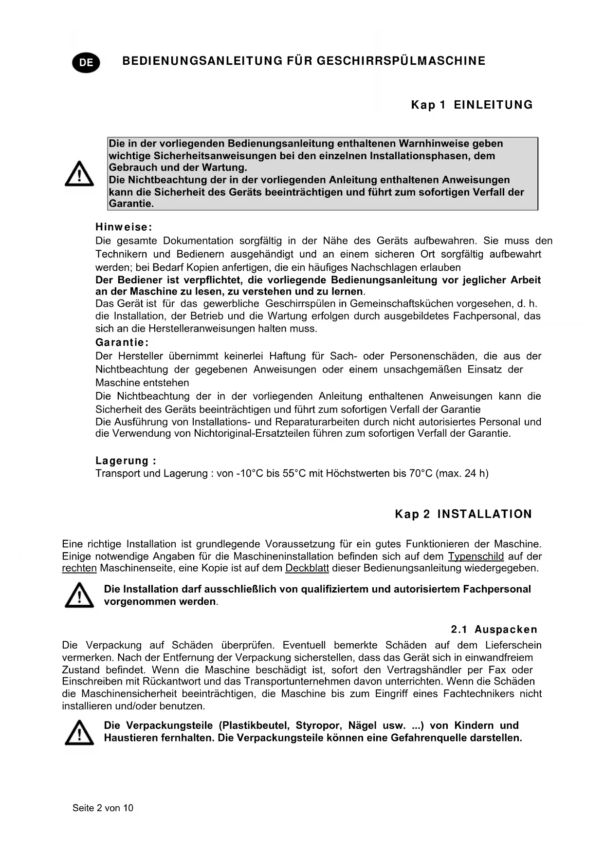 Die in der vorliegenden Bedienungsanleitung enthaltenen Warnhinweise geben wichtige Sicherheitsanweisungen bei den einzelnen Installationsphasen, dem Gebrauch und der Wartung. Die Nichtbeachtung der in der vorliegenden Anleitung enthaltenen Anweisungen kann die Sicherheit des Geräts beeinträchtigen und führt zum sofortigen Verfall der Garantie. Hinweise: Die gesamte Dokumentation sorgfältig in der Nähe des Geräts aufbewahren. Sie muss den Technikern und Bedienern ausgehändigt und an einem sicheren Ort sorgfältig aufbewahrt werden; bei Bedarf Kopien anfertigen, die ein häufiges Nachschlagen erlauben Der Bediener ist verpflichtet, die vorliegende Bedienungsanleitung vor jeglicher Arbeit an der Maschine zu lesen, zu verstehen und zu lernen. Das Gerät ist für das gewerbliche Geschirrspülen in Gemeinschaftsküchen vorgesehen, d. h. die Installation, der Betrieb und die Wartung erfolgen durch ausgebildetes Fachpersonal, das sich an die Herstelleranweisungen halten muss. Garantie: Der Hersteller übernimmt keinerlei Haftung für Sach- oder Personenschäden, die aus der Nichtbeachtung der gegebenen Anweisungen oder einem unsachgemäßen Einsatz der Maschine entstehen Die Nichtbeachtung der in der vorliegenden Anleitung enthaltenen Anweisungen kann die Sicherheit des Geräts beeinträchtigen und führt zum sofortigen Verfall der Garantie Die Ausführung von Installations- und Reparaturarbeiten durch nicht autorisiertes Personal und die Verwendung von Nichtoriginal-Ersatzteilen führen zum sofortigen Verfall der Garantie. Lagerung : Transport und Lagerung : von -10°C bis 55°C mit Höchstwerten bis 70°C (max. 24 h) Kap 2 INSTALLATION
