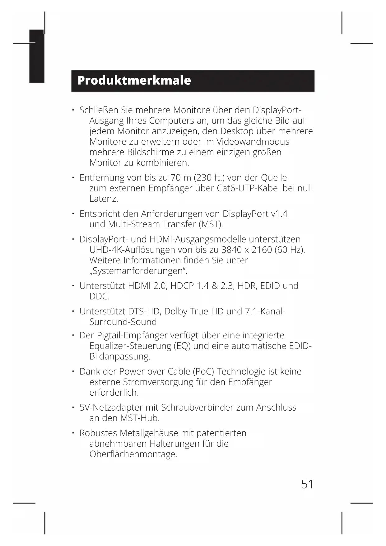- Entfernung von bis zu 70 m (230 ft.) von der Quelle zum externen Empfänger über Cat6-UTP-Kabel bei null Latenz.