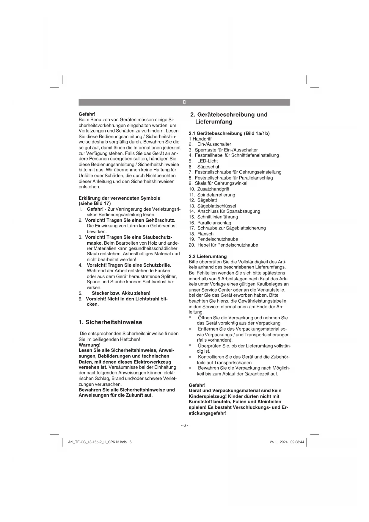 Schalten Sie das Gerät aus, wenn es nicht benutzt wird. Vorsicht! Restrisiken Auch wenn Sie dieses Elektrowerkzeug vorschriftsmäßig bedienen, bleiben immer Restrisiken bestehen. Folgende Gefahren Anl_TE-CS_18-165-2_Li_SPK13.indb 7Anl_TE-CS_18-165-2_Li_SPK13.indb 7 25.11.2024 09:38:4425.11.2024 09:38:44D