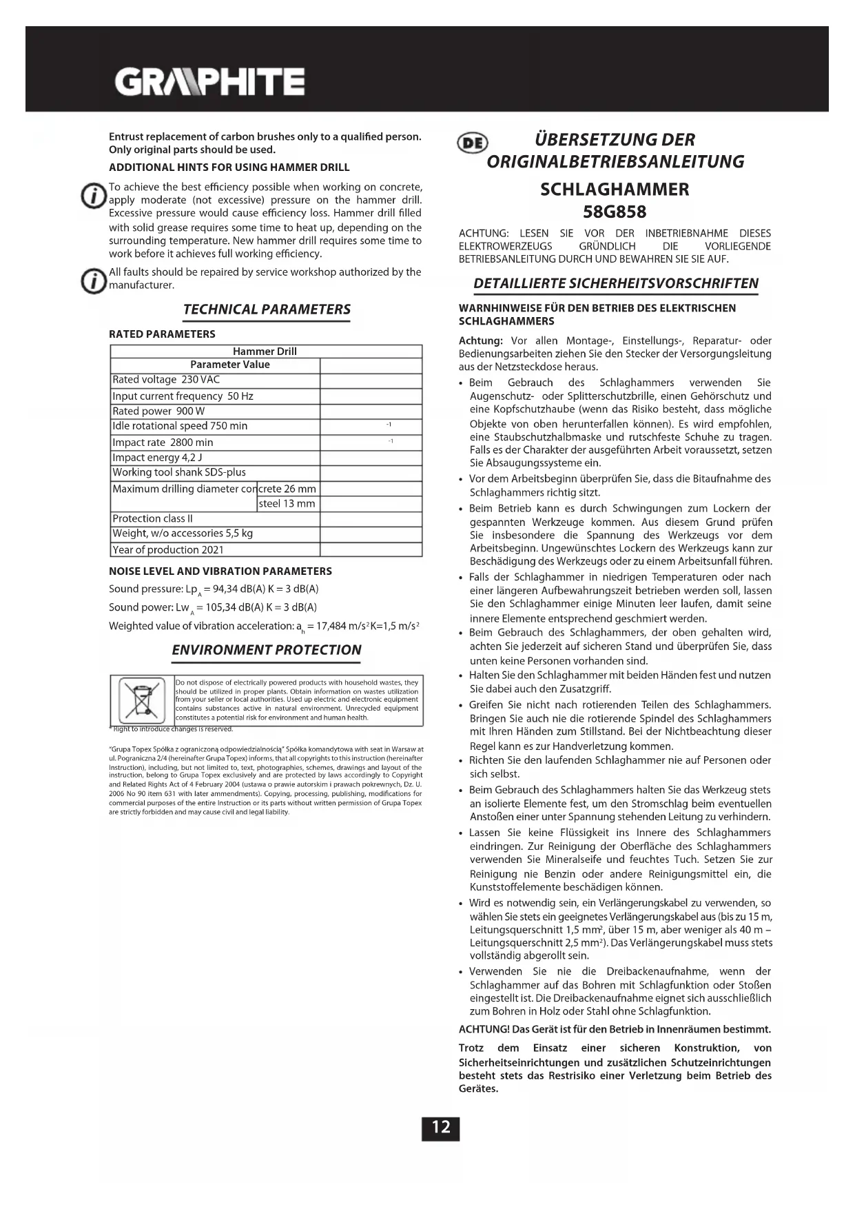 ÜBERSETZUNG DER ORIGINALBETRIEBSANLEITUNG SCHLAGHAMMER 58G858