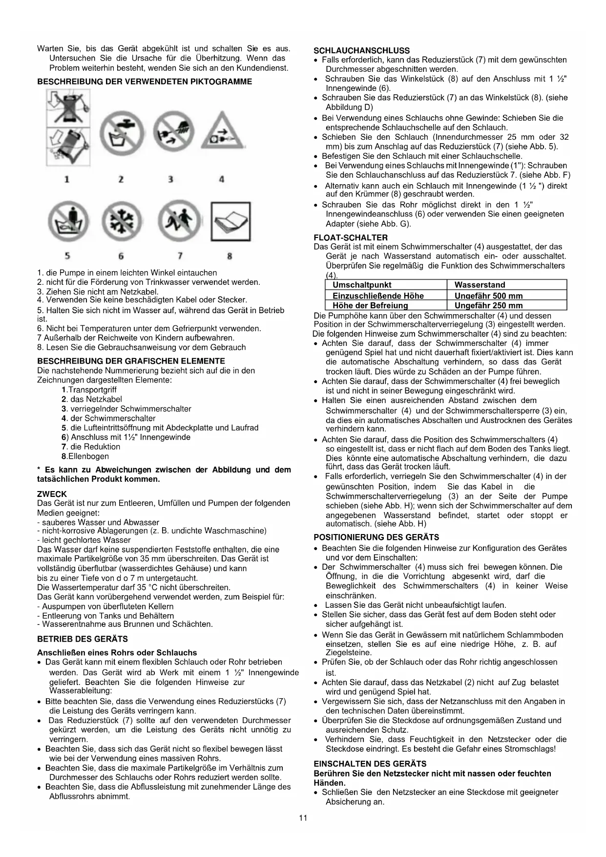 - Es kann zu Abweichungen zwischen der Abbildung und dem tatsächlichen Produkt kommen. ZWECK Das Gerät ist nur zum Entleeren, Umfüllen und Pumpen der folgenden Medien geeignet: - sauberes Wasser und Abwasser - nicht-korrosive Ablagerungen (z. B. undichte Waschmaschine) - leicht gechlortes Wasser Das Wasser darf keine suspendierten Feststoffe enthalten, die eine maximale Partikelgröße von 35 mm überschreiten. Das Gerät ist vollständig überflutbar (wasserdichtes Gehäuse) und kann bis zu einer Tiefe von d o 7 m untergetaucht. Die Wassertemperatur darf 35 °C nicht überschreiten. Das Gerät kann vorübergehend verwendet werden, zum Beispiel für: - Auspumpen von überfluteten Kellern - Entleerung von Tanks und Behältern - Wasserentnahme aus Brunnen und Schächten.