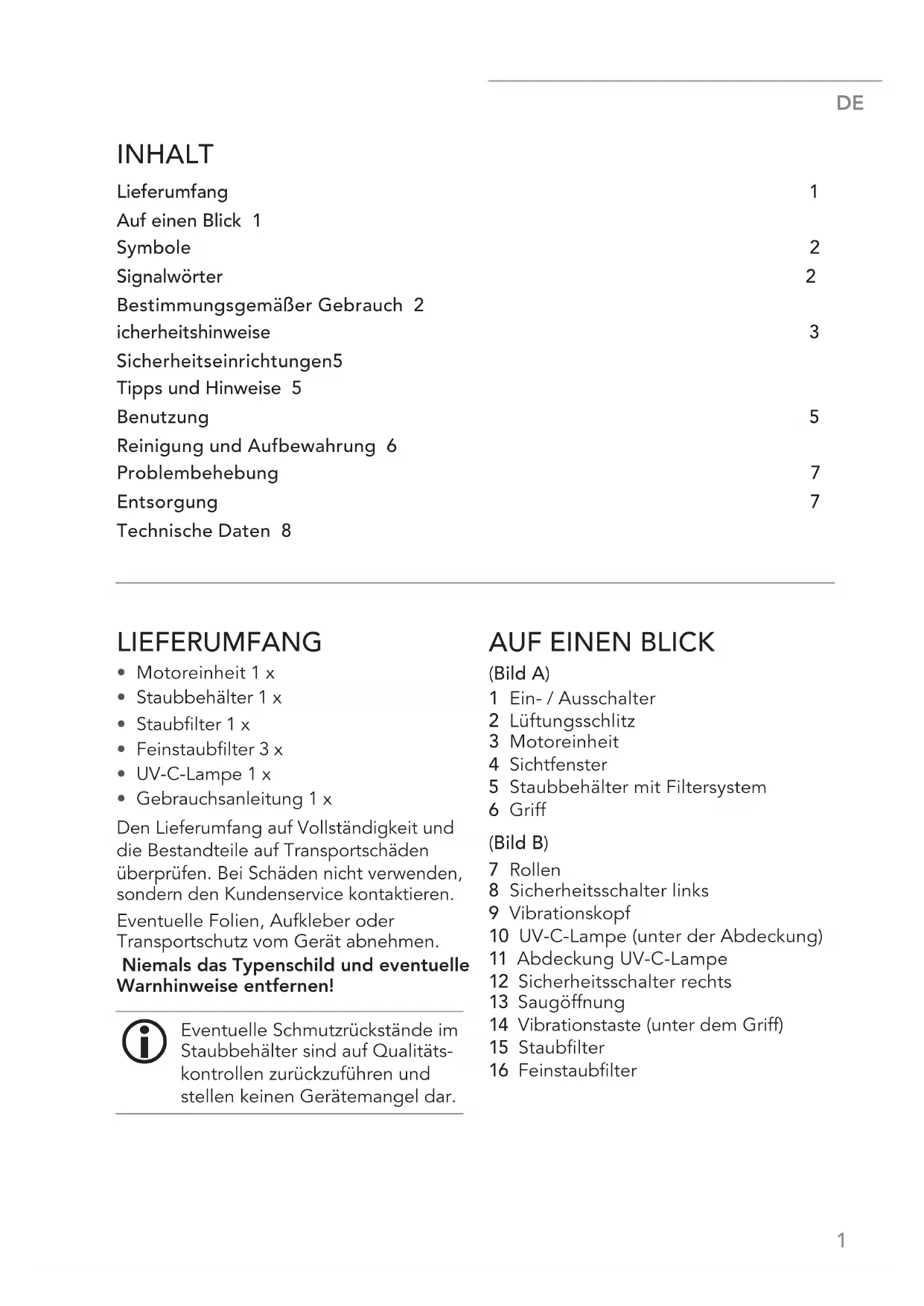 (Bild A) 1 Ein- / Ausschalter 2 Lüftungsschlitz 3 Motoreinheit 4 Sichtfenster 5 Staubbehälter mit Filtersystem 6 Griff (Bild B) 7 Rollen 8 Sicherheitsschalter links 9 Vibrationskopf 10 UV-C-Lampe (unter der Abdeckung) 11 Abdeckung UV-C-Lampe 12 Sicherheitsschalter rechts 13 Saugöffnung 14 Vibrationstaste (unter dem Griff) 15 Staubfilter 16 Feinstaubfilter INHALT Lieferumfang 1 Auf einen Blick 1 Symbole 2 Signalwörter 2 Bestimmungsgemäßer Gebrauch 2 icherheitshinweise 3 Sicherheits einrichtungen 5 Tipps und Hinweise 5 Benutzung 5 Reinigung und Aufbewahrung 6 Problembehebung 7 Entsorgung 7 Technische Daten 8DE