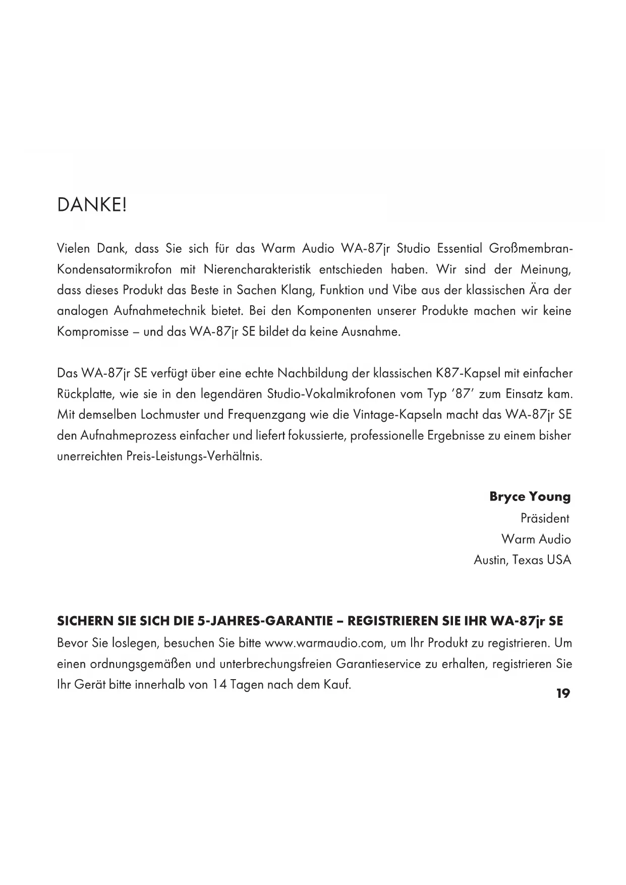 - Sensibilidad: -37 dBV o 14 mV/Pa19 DANKE! Vielen Dank, dass Sie sich für das Warm Audio WA-87jr Studio Essential Großmembran- Kondensatormikrofon mit Nierencharakteristik entschieden haben. Wir sind der Meinung, dass dieses Produkt das Beste in Sachen Klang, Funktion und Vibe aus der klassischen Ära der analogen Aufnahmetechnik bietet. Bei den Komponenten unserer Produkte machen wir keine Kompromisse – und das WA-87jr SE bildet da keine Ausnahme. Das WA-87jr SE verfügt über eine echte Nachbildung der klassischen K87-Kapsel mit einfacher Rückplatte, wie sie in den legendären Studio-Vokalmikrofonen vom Typ ‘87’ zum Einsatz kam. Mit demselben Lochmuster und Frequenzgang wie die Vintage-Kapseln macht das WA-87jr SE den Aufnahmeprozess einfacher und liefert fokussierte, professionelle Ergebnisse zu einem bisher unerreichten Preis-Leistungs-Verhältnis. Bryce Young Präsident Warm Audio Austin, Texas USA SICHERN SIE SICH DIE 5-JAHRES-GARANTIE – REGISTRIEREN SIE IHR WA-87jr SE Bevor Sie loslegen, besuchen Sie bitte www.warmaudio.com, um Ihr Produkt zu registrieren. Um einen ordnungsgemäßen und unterbrechungsfreien Garantieservice zu erhalten, registrieren Sie Ihr Gerät bitte innerhalb von 14 Tagen nach dem Kauf.20