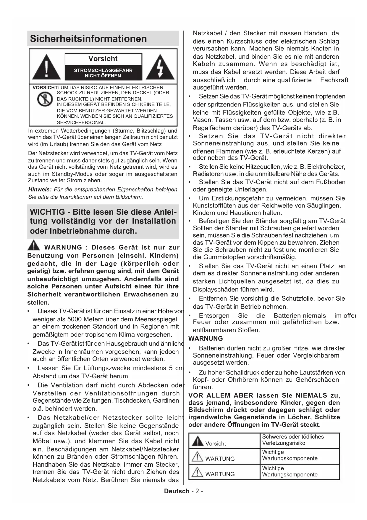 - Zu hoher Schalldruck oder zu hohe Lautstärken von Kopf- oder Ohrhörern können zu Gehörschäden führen. VOR ALLEM ABER lassen Sie NIEMALS zu, dass jemand, insbesondere Kinder, gegen den Bildschirm drückt oder dagegen schlägt oder irgendwelche Gegenstände in Löcher, Schlitze oder andere Önungen im TV-Gerät steckt. Vorsicht Schweres oder tödliches Verletzungsrisiko WARTUNG Wichtige Wartungskomponente WARTUNG Wichtige WartungskomponenteDeutsch - 3 - Kennzeichnungen auf dem Gerät Die folgenden Symbole werden auf dem Gerät als Kennzeichnungen für Einschränkungen und Vorsichtsmaßnahmen sowie Sicherheitshinweise