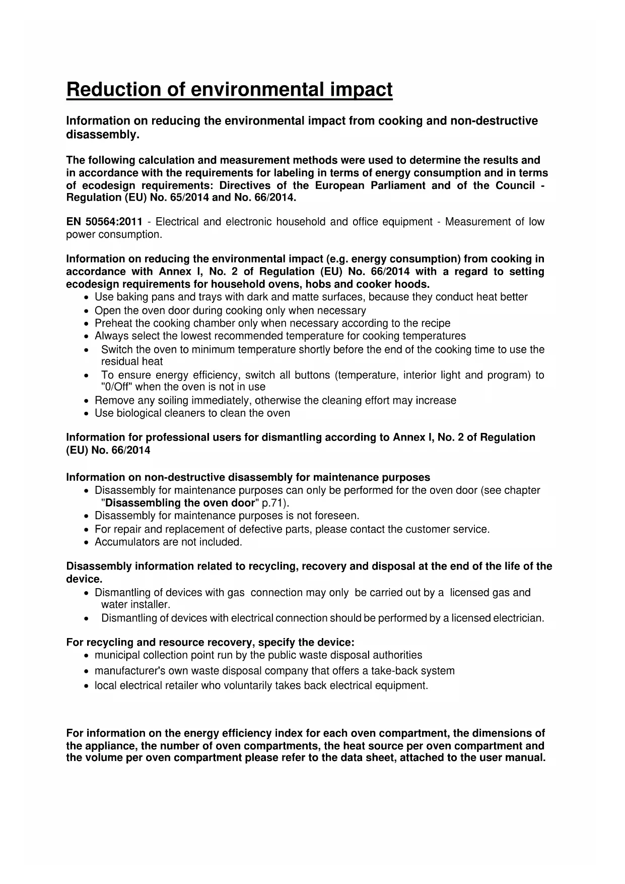 - Verwenden Sie zum Reinigen des Backofens biologische Reiniger Informationen an professionelle Nutzer zur Demontage nach Anhang I, Nr. 2 der Verordnung (EU) Nr. 66/2014 Informationen zur zerstörungsfreien Demontage zu Wartungszwecken