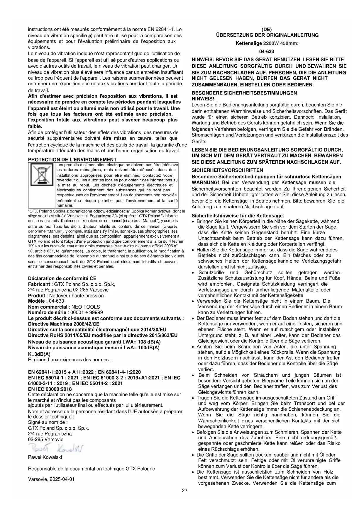 EN IEC 63000:2018 Diese Erklärung bezieht sich nur auf die Maschine in der Form, in der sie in Verkehr gebracht wird, und umfasst keine Bauteile vom Endnutzer hinzugefügt oder von ihm nachträglich durchgeführt werden. Name und Anschrift der in der EU ansässigen Person, die zur Erstellung des technischen Dossiers befugt ist: Unterzeichnet im Namen von: GTX Poland Sp. z o.o. Sp.k. 2/4 Pograniczna Straße 02-285 Warschau Paweł Kowalski Beauftragter für technische Dokumentation GTX Polen Warschau, 2025-04-01 (RU) ПЕРЕВОД ОРИГИНАЛЬНЫХ ИНСТРУКЦИЙ Бензопила 2200 Вт 450 мм: 04-633 ПРИМЕЧАНИЕ: ПЕРЕД ИСПОЛЬЗОВАНИЕМ ОБОРУДОВАНИЯ ВНИМАТЕЛЬНО ПРОЧИТАЙТЕ ДАННОЕ РУКОВОДСТВО И СОХРАНИТЕ ЕГО ДЛЯ ДАЛЬНЕЙШЕГО ИСПОЛЬЗОВАНИЯ. ЛИЦАМ, НЕ ОЗНАКОМИВШИМСЯ С ИНСТРУКЦИЕЙ, ЗАПРЕЩАЕТСЯ ВЫПОЛНЯТЬ МОНТАЖ, НАСТРОЙКУ ИЛИ ЭКСПЛУАТАЦИЮ ОБОРУДОВАНИЯ. ОСОБЫЕ ПОЛОЖЕНИЯ ПО БЕЗОПАСНОСТИ