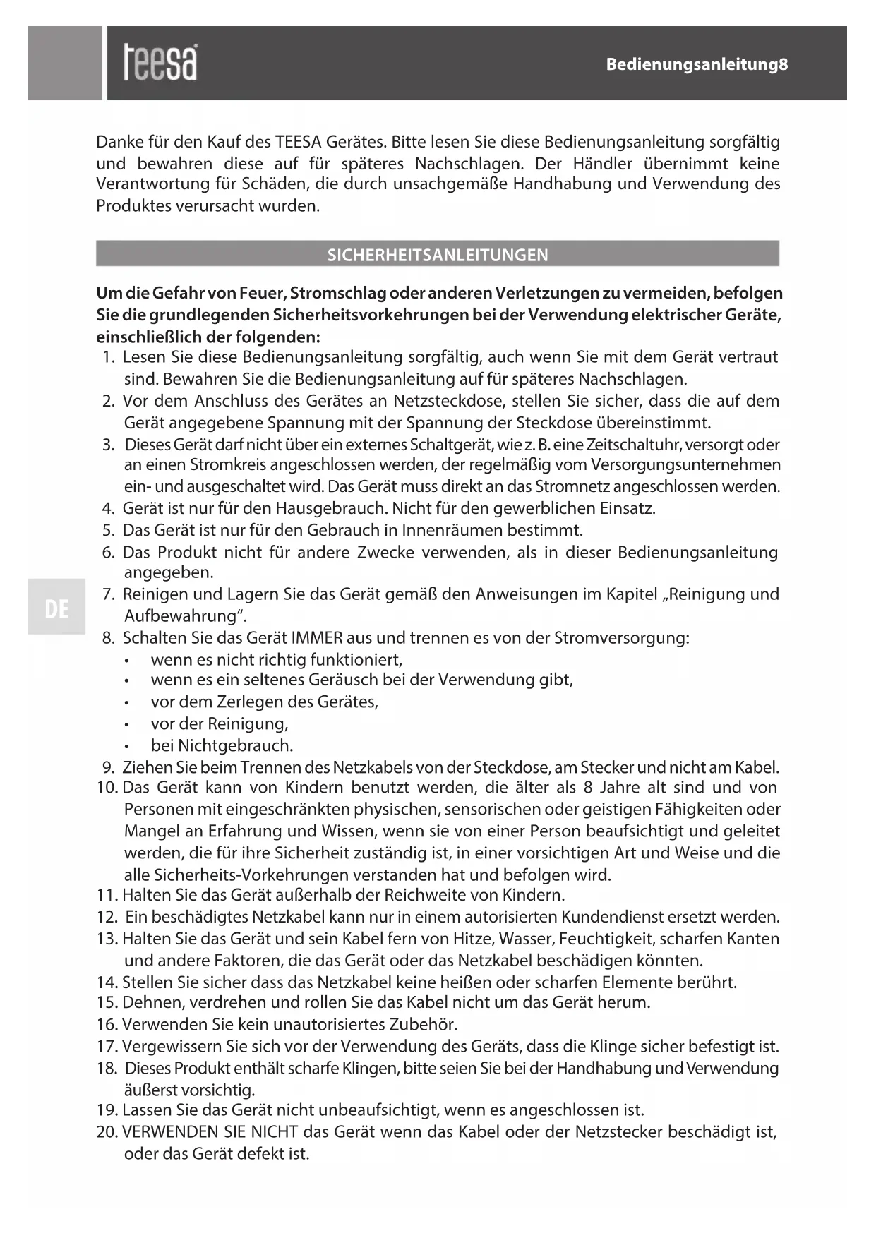 Danke für den Kauf des TEESA Gerätes.itte lessen Sie diese Bedienungsanleitung sorgfältig und bewahrenne dieser auf fur späteres Nachschlagen.Der Handler übernimmt keine Verantwortung fur Schaden, die durch unsachgemäß Handhabung und Verwendung des Produktess verursacht wurden.