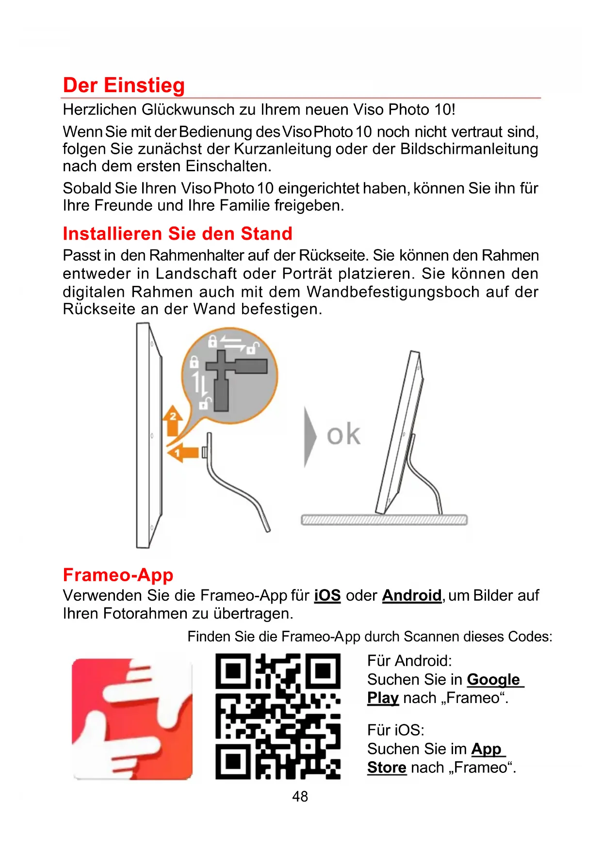 pp durch Scannen dieses Codes: Für Android: Suchen Sie in Google Play nach „Frameo“. Für iOS: Suchen Sie im App Store nach „Frameo“.49 Schnelleinrichtung Wenn Sie den Fotorahmen zum ersten Mal starten, müssen Sie ihn zuerst einrichten. ● Wählen Sie eine Sprache aus. Diese Sprache wird in den Menüs verwendet. ● Verbinden Sie Ihren Fotorahmen mit dem Internet, indem Sie eine Verbindung mit einem WLAN herstellen. ● Überprüfen oder korrigieren Sie Datum und Uhrzeit. ● Der Viso Photo 10 fordert Sie möglicherweise auf, ihn auf die neueste Version zu aktualisieren. Es ist empfehlenswert, den Fotorahmen zu aktualisieren, bevor Sie fortfahren, wenn Sie dazu aufgefordert werden.