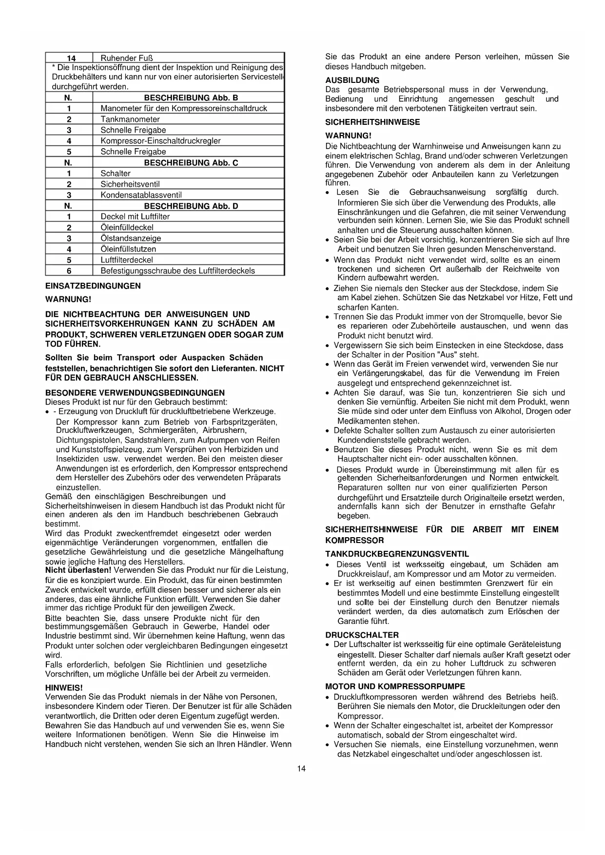 - - Erzeugung von Druckluft für druckluftbetriebene Werkzeuge. Der Kompressor kann zum Betrieb von Farbspritzgeräten, Druckluftwerkzeugen, Schmiergeräten, Airbrushern, Dichtungspistolen, Sandstrahlern, zum Aufpumpen von Reifen und Kunststoffspielzeug, zum Versprühen von Herbiziden und Insektiziden usw. verwendet werden. Bei den meisten dieser Anwendungen ist es erforderlich, den Kompressor entsprechend dem Hersteller des Zubehörs oder des verwendeten Präparats einzustellen. Gemäß den einschlägigen Beschreibungen und Sicherheitshinweisen in diesem Handbuch ist das Produkt nicht für einen anderen als den im Handbuch beschriebenen Gebrauch bestimmt. Wird das Produkt zweckentfremdet eingesetzt oder werden eigenmächtige Veränderungen vorgenommen, entfallen die gesetzliche Gewährleistung und die gesetzliche Mängelhaftung sowie jegliche Haftung des Herstellers. Nicht überlasten! Verwenden Sie das Produkt nur für die Leistung, für die es konzipiert wurde. Ein Produkt, das für einen bestimmten Zweck entwickelt wurde, erfüllt diesen besser und sicherer als ein anderes, das eine ähnliche Funktion erfüllt. Verwenden Sie daher immer das richtige Produkt für den jeweiligen Zweck. Bitte beachten Sie, dass unsere Produkte nicht für den bestimmungsgemäßen Gebrauch in Gewerbe, Handel oder Industrie bestimmt sind. Wir übernehmen keine Haftung, wenn das Produkt unter solchen oder vergleichbaren Bedingungen eingesetzt wird. Falls erforderlich, befolgen Sie Richtlinien und gesetzliche Vorschriften, um mögliche Unfälle bei der Arbeit zu vermeiden. HINWEIS! Verwenden Sie das Produkt niemals in der Nähe von Personen, insbesondere Kindern oder Tieren. Der Benutzer ist für alle Schäden verantwortlich, die Dritten oder deren Eigentum zugefügt werden. Bewahren Sie das Handbuch auf und verwenden Sie es, wenn Sie weitere Informationen benötigen. Wenn Sie die Hinweise im Handbuch nicht verstehen, wenden Sie sich an Ihren Händler. Wenn Sie das Produkt an eine andere Person verleihen, müssen Sie dieses Handbuch mitgeben. AUSBILDUNG Das gesamte Betriebspersonal muss in der Verwendung, Bedienung und Einrichtung angemessen geschult und insbesondere mit den verbotenen Tätigkeiten vertraut sein. SICHERHEITSHINWEISE WARNUNG! Die Nichtbeachtung der Warnhinweise und Anweisungen kann zu einem elektrischen Schlag, Brand und/oder schweren Verletzungen führen. Die Verwendung von anderem als dem in der Anleitung angegebenen Zubehör oder Anbauteilen kann zu Verletzungen führen.
